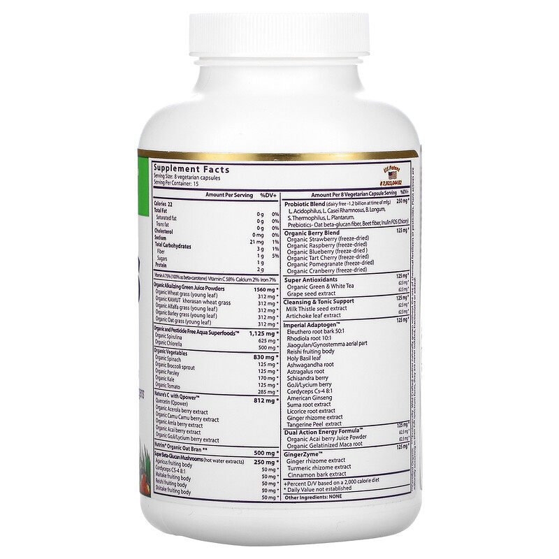 Количество таблицы компонентов добавок за время: 8 капсул с образованием для каждого часа упаковки: 15 на часть содержания Ежедневный процент потребления+ тепло 22 Общая сумма жира 0 граммов 0% насыщенного жира 0 граммов 0% транс -жира 0 граммов 0% холестерин 0 мг 0% натрия 21 мг 1% углеводов 3 грамма 1% волокна 1 г 5% сахар 1 грамм белок 2 грамма витамина А 75% (всеβ-Каротин), 58%витамин С, 2%кальций, 7%железо органический щелочный порошок зеленых фруктов 1560 мг * Органическая пшеничная трава (молодые листья) 312 мг * Органическая трава пшеницы Камут Хорасан 312 мг * Органический фиолетовый цветок 蓿 (нежные листья) 312 мг * Органическая ячменная трава (молодые листья) 312 мг * Органическая овсяная вода (нежные листья) 312 мг * Super Food на основе органических и неагриномических реагентов на основе водных ресурсов™ 1125 мг * Органическая спирала 625 мг * Органические маленькие шариковые водоросли 500 мг * Органические овощи 830 мг * Органический шпинат 125 мг * Органический Зеландия Цветочный Буд 125 мг * Органическая земля 170 мг * Капуста органических перьев 125 мг * Органические помидоры 285 мг * Nature C содержит QPower™Органическая игла Хлорофитная вишневая экстракт вишневой вишне 812 мг * Nutrim®Органические овсяные отруби ** 500 мг * Суперβ-Пеппетиноза гриб (горячая вода поднята) 250 мг * Грибная сущность 50 мг * Cordyceceps CS-4 8: 1 50 мг * Танцевальная сущность Сако 50 мг * CHIZHI ENTITY 50 мг * Shiitizi Entity 50 мг * Смесь пробиотиков (продукты без молочных продуктов -1,2 миллиарда) NCFM, мышиная лаггапусакура, длинная бизидобактерия, Streptococcus Thermophilus, Plant Lactobacillus.Пробиотики -атсβПолисахаридное волокно, свеклу 250 мг * Органическая гибридная органическая клубничная (замороженная) органическая малиновая малиновая (замороженная) органическая черника (замороженная) вишневая вишня (замороженная) органический гранат (замороженный сушеный) Органический хрустящий апельсин (замороженная) 125 мг * Супер -антиоксидантные ингредиенты 125 мг * Органический зеленый чай и белый чай 62,5 мг * Экстракт виноградной косточки 62,5 мг * Помощь в уборке и питании 125 мг * Извлечение семян с водой 62,5 мг * Детуиты корейских листьев чертополох 62,5 мг * Усовершенствованная адаптация™Приготовленный на пару wuta Genpi 50: 1 Генерал Генерал 10: 1 Tien разделяет на голубой земле части пьяного баклажана Сен-Лаэля, астрагала-корневой шисандры, волчья обращена 125 мг * Формула с двойной энергией™ 125 мг * Органический бразильский ягодный сок порошок 62,5 мг * Организовать Макаен 62,5 мг * GingerZyme™Экстракт корня имбиря, экстракт ствола корня имбиря, экстракт корицы с корицей 125 мг *Ежедневный процент потребления ежедневного потребления на основе калорий 2000 года *Ежедневный процент потребления не определяется ** Органическое распознавание *** Экологическая дикая посадка и/или использование химических удобрений или агрономических реагентов во время процесса роста.Ингредиенты активности растений естественным образом существуют в многоподобных формах, и они не разделены и не добавляются!