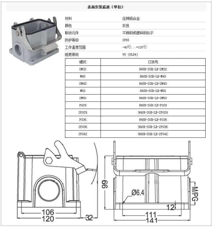 Корпус разъема с тяжелой нагрузкой H48B-SGR-LB Установка поверхности (одна пряжка)