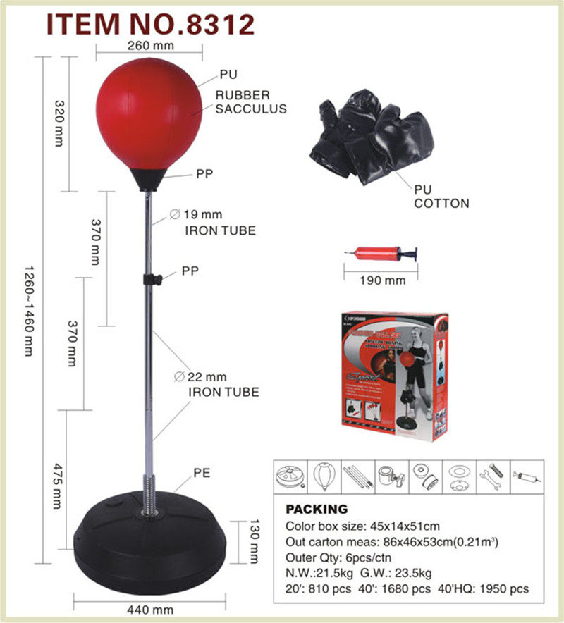 | Описание продукта: | Регулируемая высота: 126–146 см. Конфигурация: 1 резиновый мяч диаметром 11 дюймов; 1 пластиковая основа диаметром 44см; 1 комплект детских перчаток весом 300 г; 1 4-дюймовый насос; 20':800 pcs 40':1657pcs 40'HQ:1942pcs |