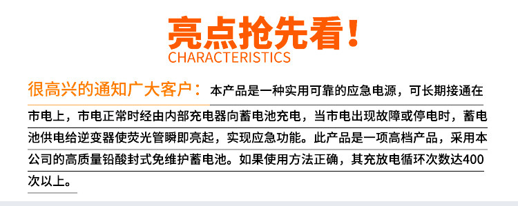 Данное изделие представляет собой практичный и надежный источник аварийного электропитания, который можно подключать к электросети на длительное время. Когда сеть в норме, аккумулятор заряжается через внутреннее зарядное устройство. При отключении электросети или отключении электроэнергии батарея подает питание на инвертор, поэтому люминесцентная лампа мгновенно загорается для реализации аварийной функции.Этот продукт представляет собой высококачественный продукт, в котором используются высококачественные свинцово-кислотные герметичные необслуживаемые аккумуляторы нашей компании.При правильном использовании количество циклов зарядки и разрядки может достигать более 400 раз.