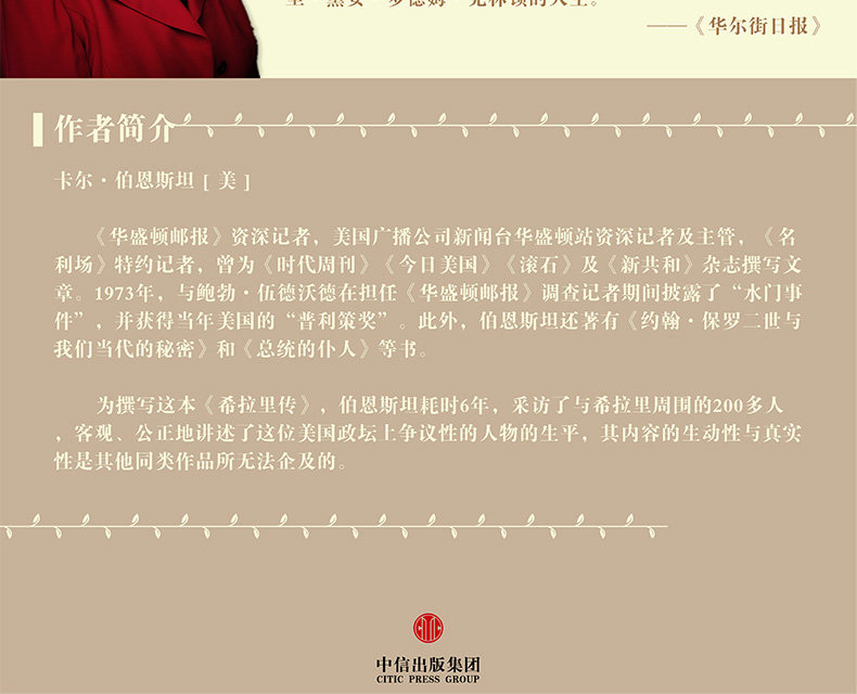 Карл&Middot; Бернштейн, старший репортер из The Washington Post, старший репортер и руководитель News Washington Station of the Broadcasting Corporation (ABC), специальный репортер «Знаменитой поля», однажды «Временная неделя» и «Новая республика». статья.В 1973 году Зенг и Боб&Middot; Woodward раскрыт во время репортера The Washington Post&инцидент с Shuimen”, получите Соединенные Штаты в этом году&Ldquo; Pulitzer Award”.Кроме того, у Бернистана также есть "Джон&Middot; Павел II и наши современные секреты и наши современные «и« слуга президента ».В этой книге Бернштейн провел шесть лет и взял интервью у более 200 друзей, коллег и политических противников, чтобы как можно больше восстановить легендарную жизнь Хиллари.