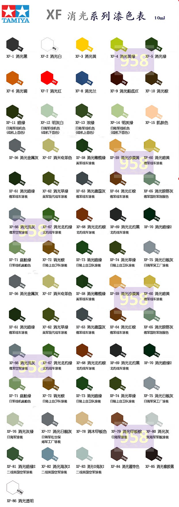| Цвет: | XF-1, XF-2 Essence White, XF-3, XF-4 замедляет желтый и зеленый, XF-5, XF-6 анти-световой меди, XF-7 замедляет красный красный, XF-8 замедляет синий, XF-9 Capital Clear Blossom Red, XF-10 медленное световое коричневое, XF-11, XF-12, XF-13, XF-14, XF-15, Xf-16 анти-световой металлический алюминий, XF-17, XF-18, XF-19, XF-20 анти-световой умеренный серый, XF-21, XF-22 Anti-Light RLM Grey, XF-23 медленно светло-голубой синий, XF-24 Black |