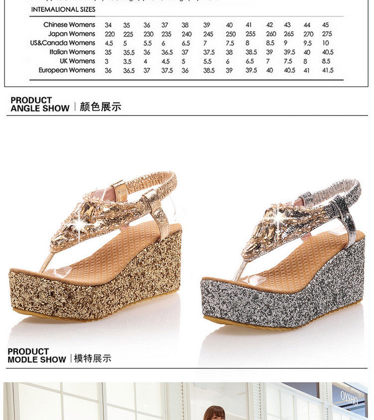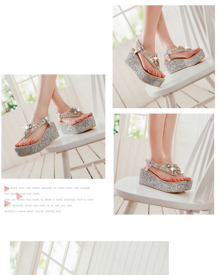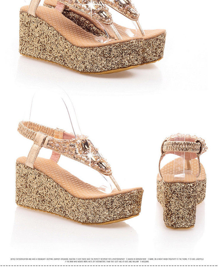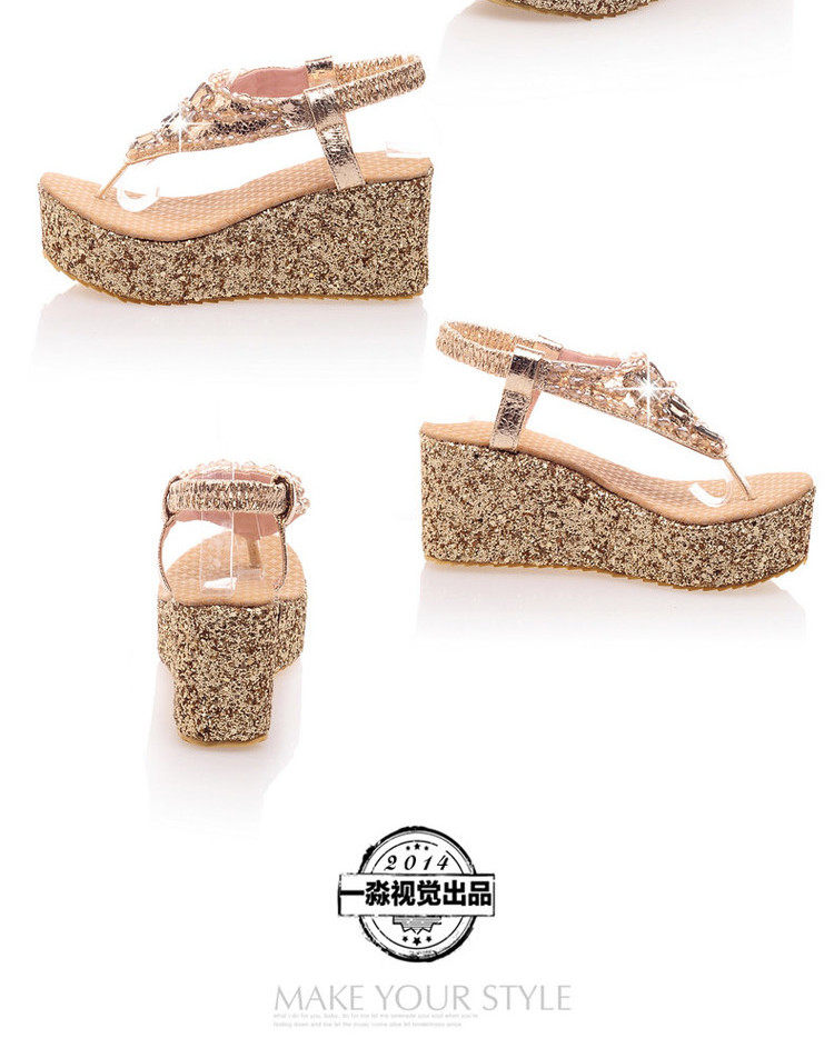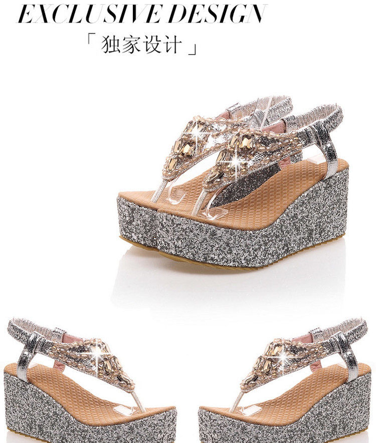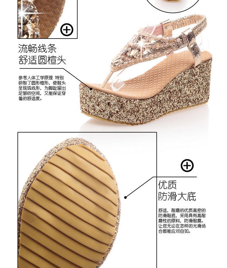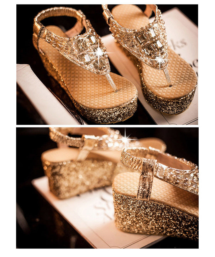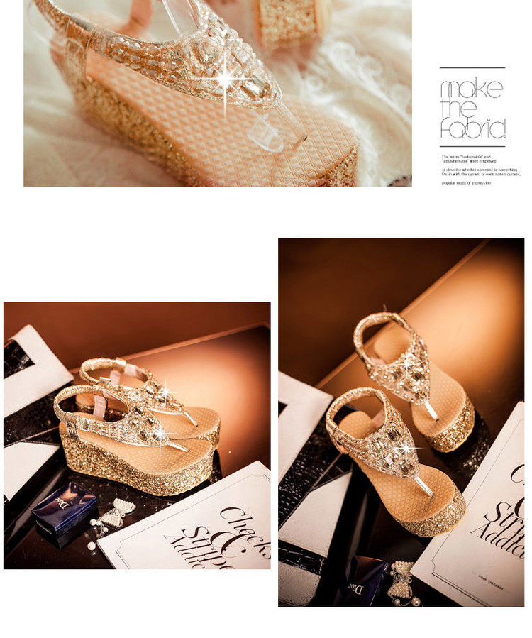 Летние шлепанцы на танкетке, пляжные сандалии, водонепроницаемые туфли на платформе, толстой подошве золотого и серебряного цвета, туфли на плоской подошве на высоком каблуке со стразами для женщин