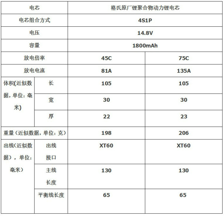 это соединение включает в себя 2 модели, все из которых составляют 1800 мАч, 4S/14,8 В, и разница в том, что множители разрядов составляют 45C и 75C соответственно.