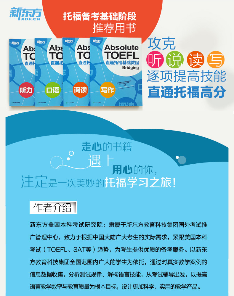 “Частые базовые учебники TOEFL”Серия тщательно создана командой преподавателей и исследователей New Oriental.Материалы основаны на многолетнем педагогическом и исследовательском опыте.Это редкие материалы для ранней подготовки к TOEFL.