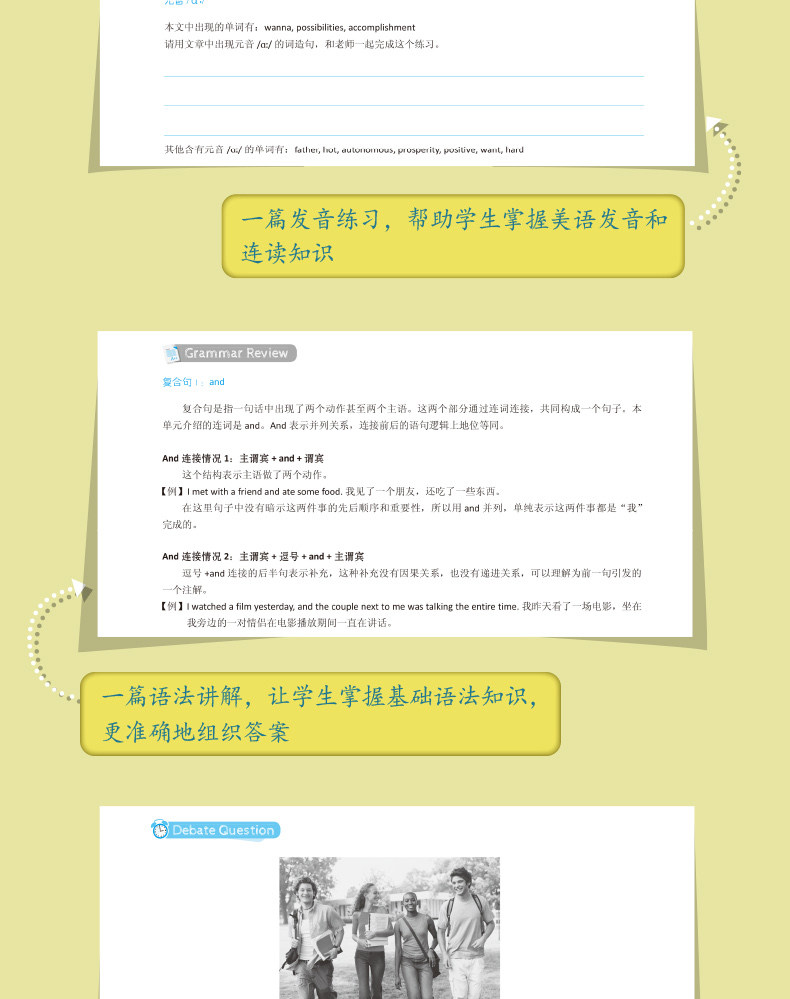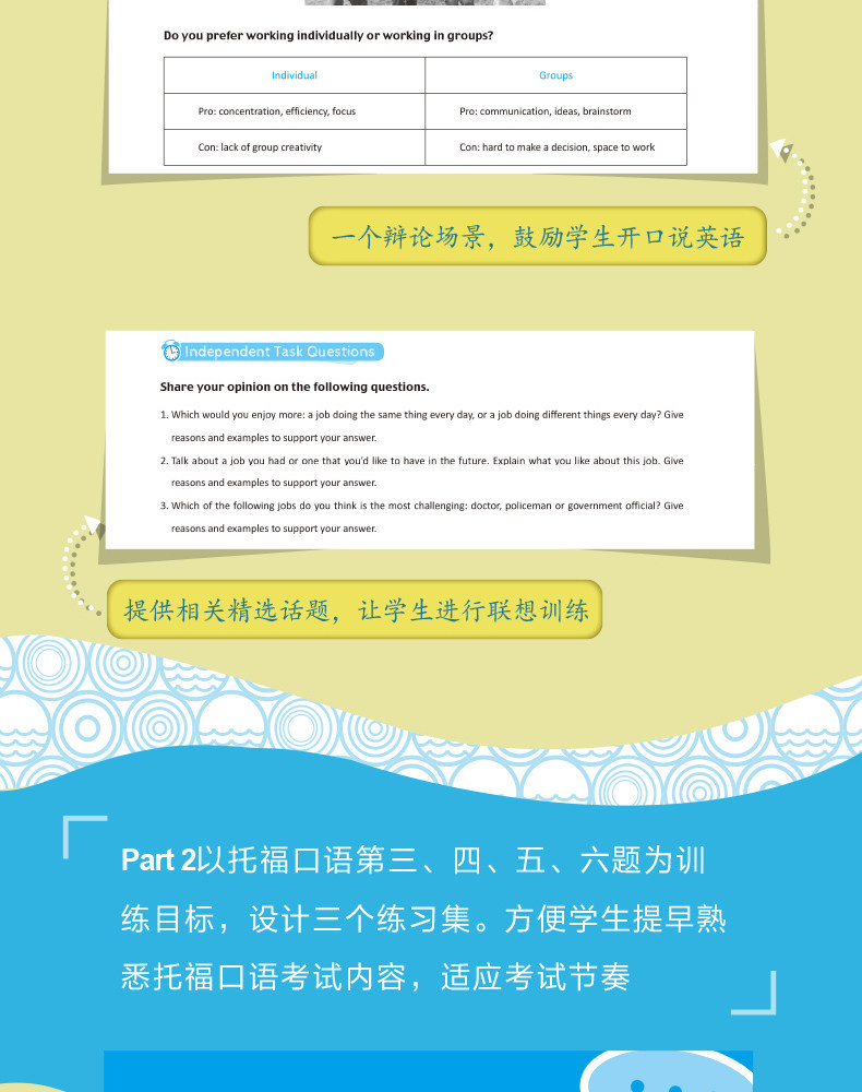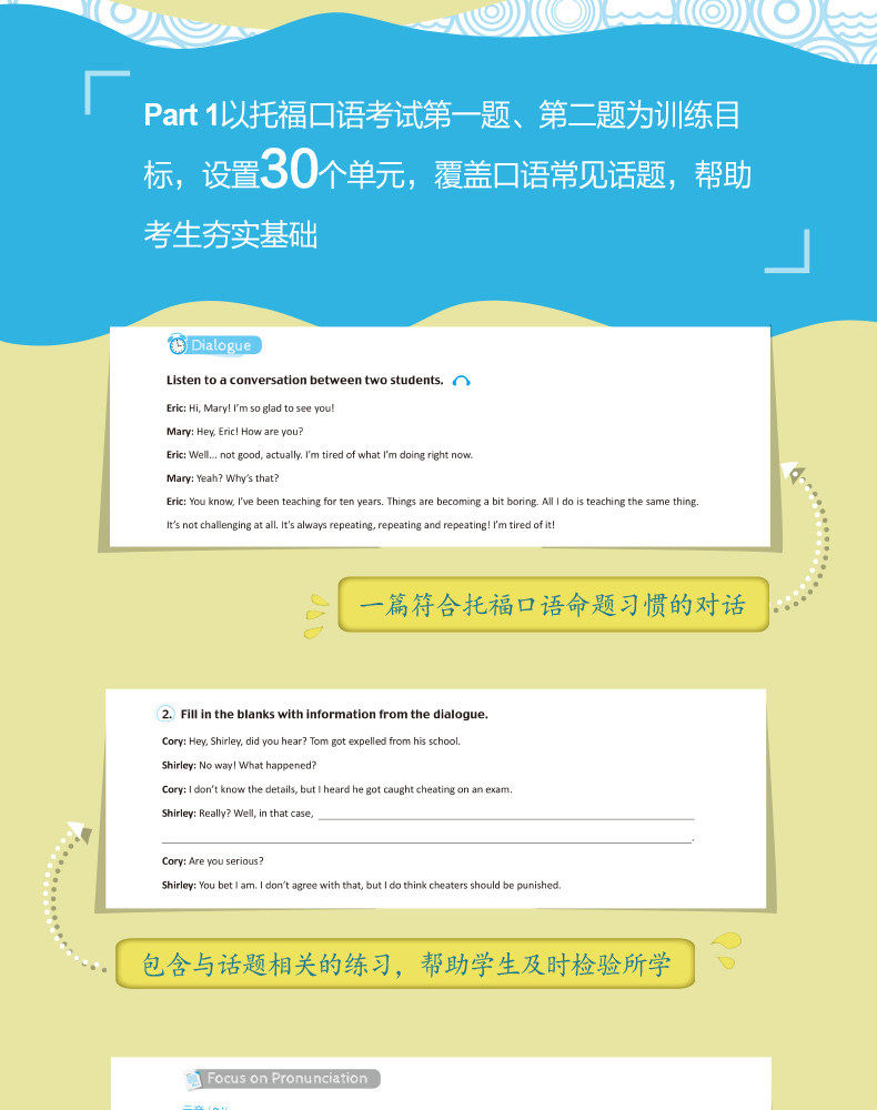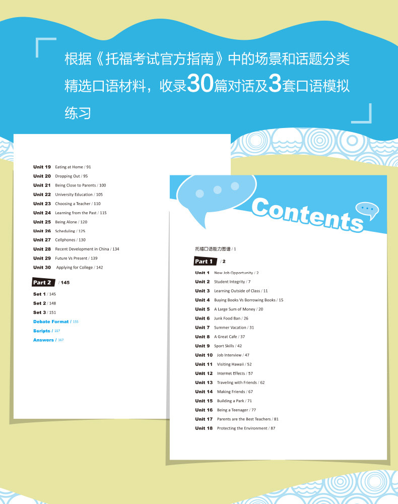 Эта книга представляет собой сборник разговорной речи, в основном разделенный на две части, охватывающие различные сценарии и темы устного теста TOEFL, а соответствующие разделы предназначены для улучшения языка.В первой части в качестве целей обучения рассматриваются первый и второй вопросы разговорной речи TOEFL, и всего она состоит из 30 разделов.Каждый раздел включает в себя диалог, соответствующий привычкам устных вопросов, упражнения на произношение, грамматические упражнения, сцену дебатов и рекомендации по соответствующим темам. Он предназначен для того, чтобы помочь кандидатам освоить американское произношение и знания непрерывного чтения, овладеть базовыми знаниями грамматики, а также побудить кандидатов говорить по-английски и добиваться постоянного прогресса.Вторая часть рассматривает вопросы 3, 4, 5 и 6 в качестве целей обучения и устанавливает три практических набора, которые помогут студентам заранее ознакомиться с содержанием разговорного теста TOEFL, адаптироваться к ритму теста и помочь с самопроверкой, самооценкой и практическими упражнениями.