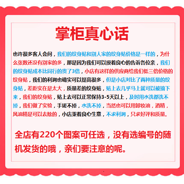 Теперь качество наклеек татуировки смешано. Не покупайте слепо, чем цена. Это не на том же уровне, что и мы.Многие магазины не упакованы независимо, и все они массы. Мне не нужно говорить качество таких продуктов. Вы все знаетеСущностьПожалуйста, украсьте глаза.Я могу обещать, Наша наклейка с высоким качеством татуировки.Я также надеюсь, что друзья смогут сравнить товар, чем три. Как говорится, товар не обманут, чем три дома, ах.