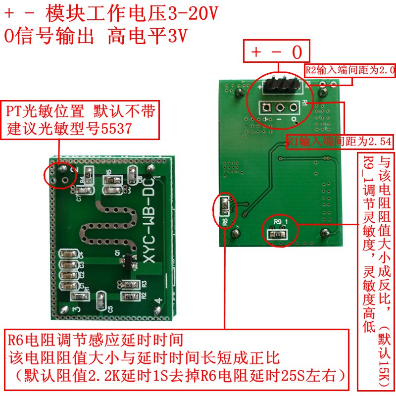 - 10. Задержка работы: около 1 секунды.(Задержка непосредственно пропорциональна значению сопротивления R6. Значение сопротивления по умолчанию на 2K задерживается на 1 секунду. Если сопротивление не сварено, отверстие составляет около 30 секунд.)