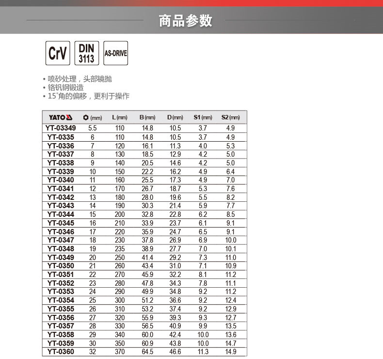 | Цвет: | YT-03349 5.5mm, YT-0335 6mm, YT-0336 7mm, YT-0337 8mm, YT-0338 9mm, YT-0339 10mm, YT-0340 11mm, YT-0341 12mm, YT-0342 13mm, YT-0343 14mm, YT-0344 15mm, YT-0345 16mm, YT-0346 17mm, YT-0347 18mm |
