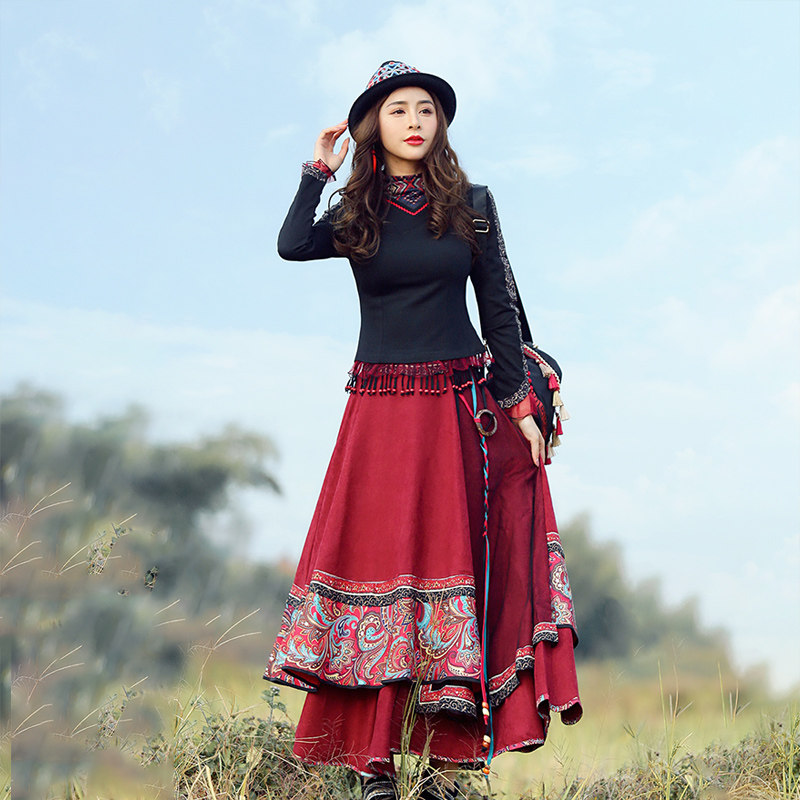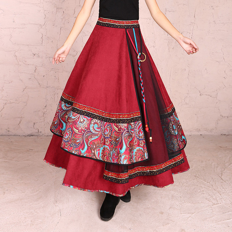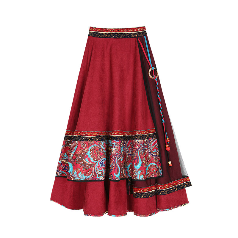 两人故事 Приталенная зимняя ретро этническая длинная юбка, этнический стиль, А-силуэт, высокая талия, длина макси, 2023