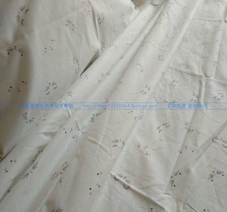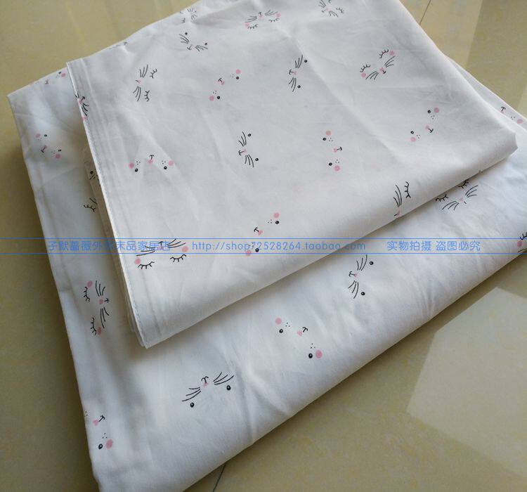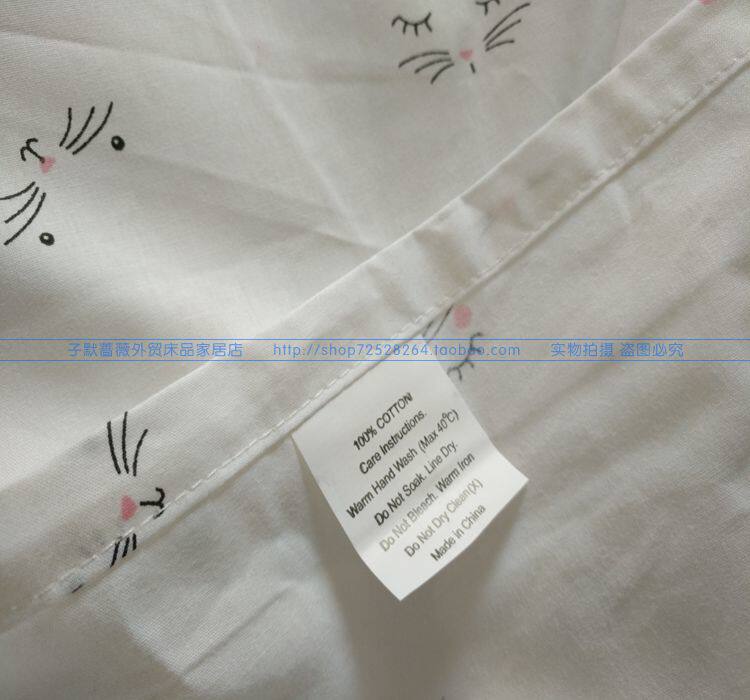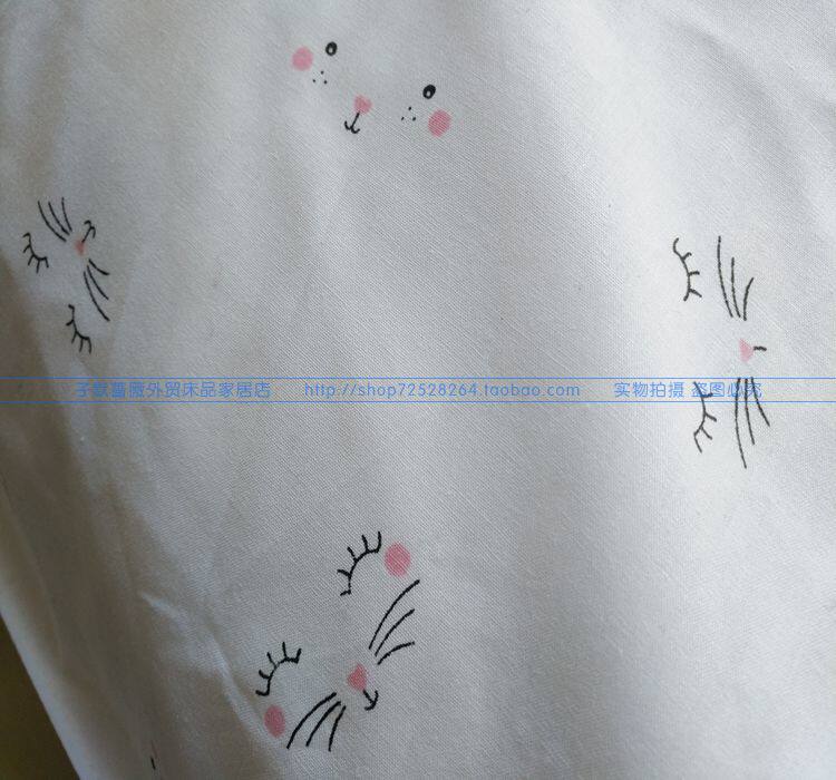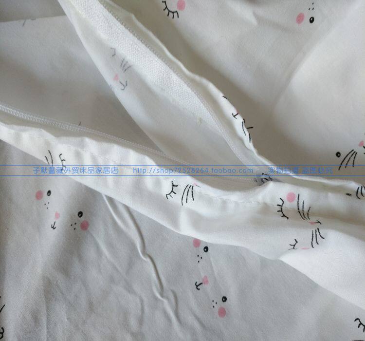 Чесаная хлопчатобумажная ткань полотняного переплетения высокой плотности плотностью 40 приятна на ощупь. Вообще говоря, чесаные хлопчатобумажные ткани с пряжей приятнее на ощупь, чем грубая пряжа. Эти грубые ткани из чистого хлопка и холщовая пряжа толще и жестче на ощупь. Ткань имеет чисто-белый фон с абстрактным рисунком кошачьей морды, милый и свежий. Пододеяльник и наволочка имеют одинаковый рисунок с обеих сторон, обе с отверстиями на молнии. По четырем углам пододеяльника имеются ремни для фиксации наполнителя одеяла, которые могут эффективно зафиксировать наполнитель одеяла и предотвратить его перемещение.