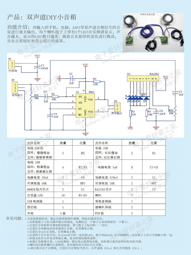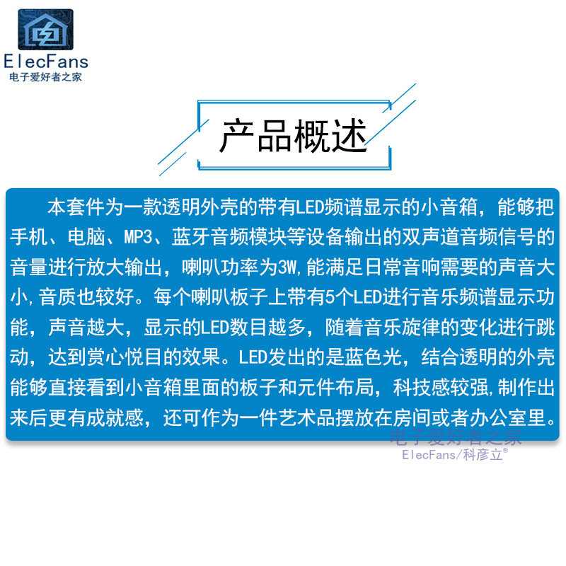 [对输入的手机、电脑、MP3等双声道音频信号的音量进行放大输出,每个喇叭板子上带有5个LED音乐频谱显示,声音越大,显示的LED数目越多,随着音乐旋律的变化进行跳动,具有音质较好和赏心悦目的效果。]