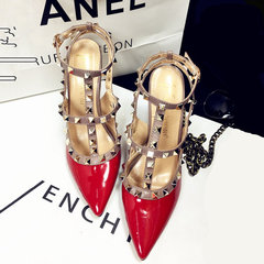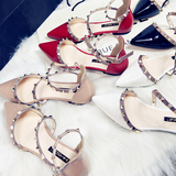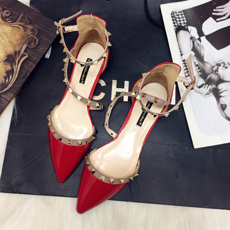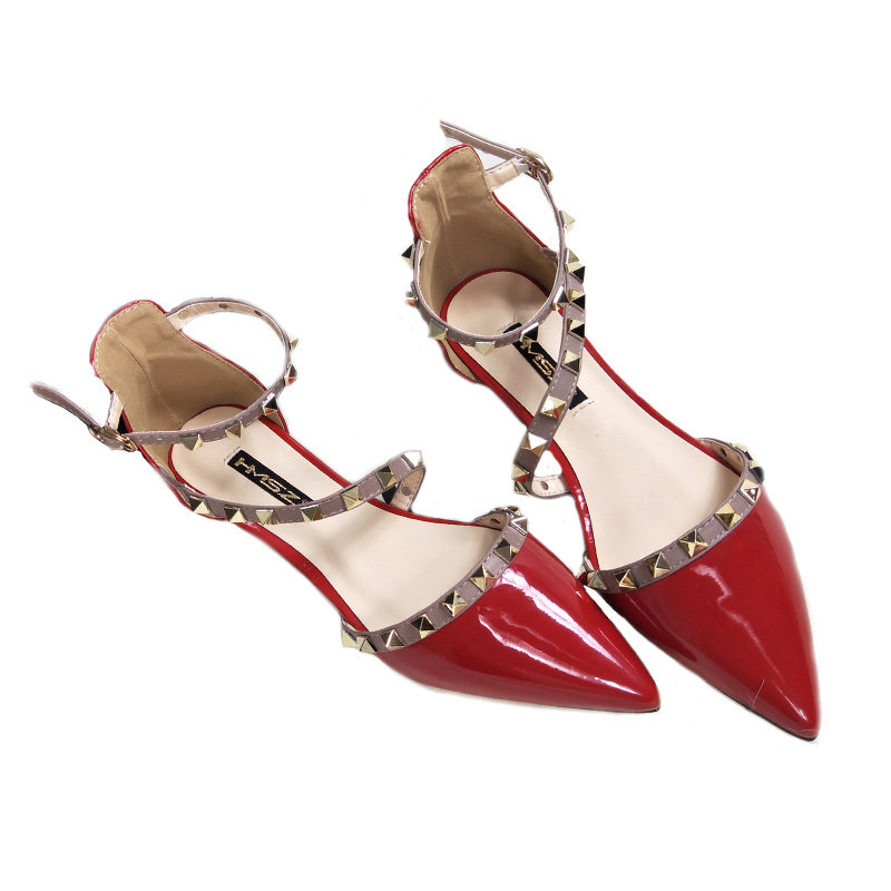 Европейские и американские модные женские туфли на плоской подошве с заклепками и острым носком, сандалии с носком, красные лакированные туфли на плоской подошве для женщин.