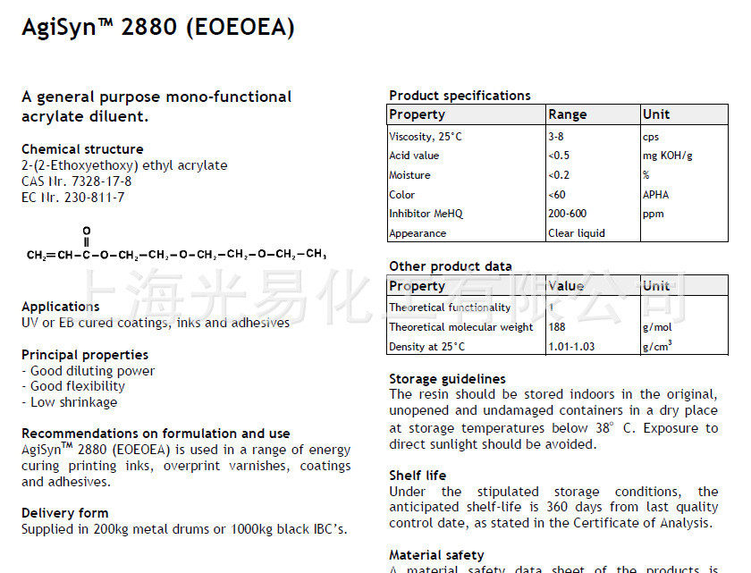 EOEOEA - это акриловый монер, который подходит для оптического затвердевания. Он может использоваться для реакций ультрафиолетовой полимеризации различных ненасыщенных систем, таких как ультрафиолетовые покрытия, ультрафиолетовые чернила и ультрафиолетовые адгезивы.