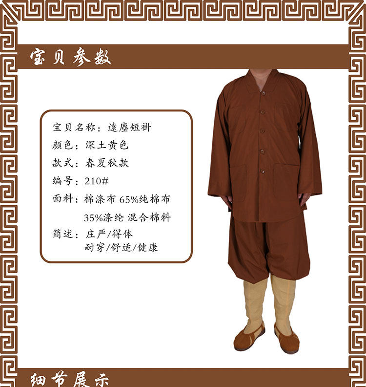 Yuanchen Monk, подающий земляную желтую хлопчатобумажную ткань Короткая куртка весна, осень, лето, мужчины и женские монахи, монахи, платья для одежды монахов