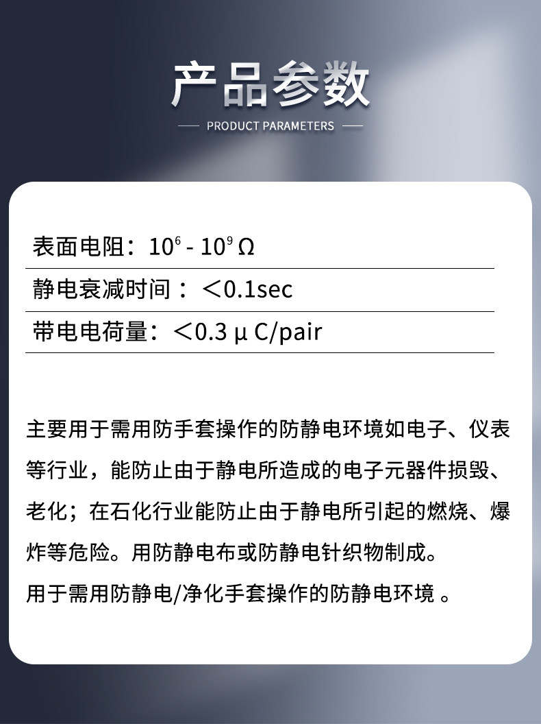 Он используется в основном для антистатических сред, таких как электроника и инструменты, которым необходимо работать с помощью перчаток, которые могут предотвратить повреждение и старение электронных компонентов, вызванных электрическими электронными компонентами;