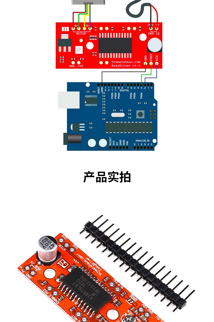 Пошаговый двигатель обычно определяет шаг -дистабильный угол или параметры шага. Общий двигатель делится на 200 шагов, то есть угол расстояния шага составляет 1,8 градуса. Для 8 сегментации, то есть каждый этап двигателя делится на 8 небольших шагов. , который может получить более точный контроль, то есть EasyDriver нуждается в 1600 шагах для завершения полного 360-дегрового вращения.