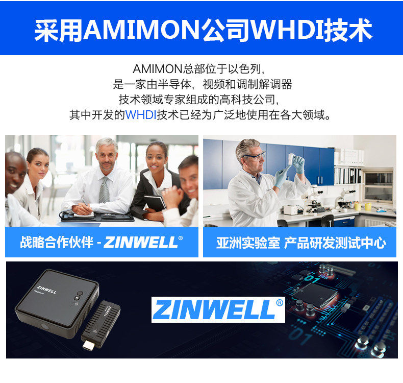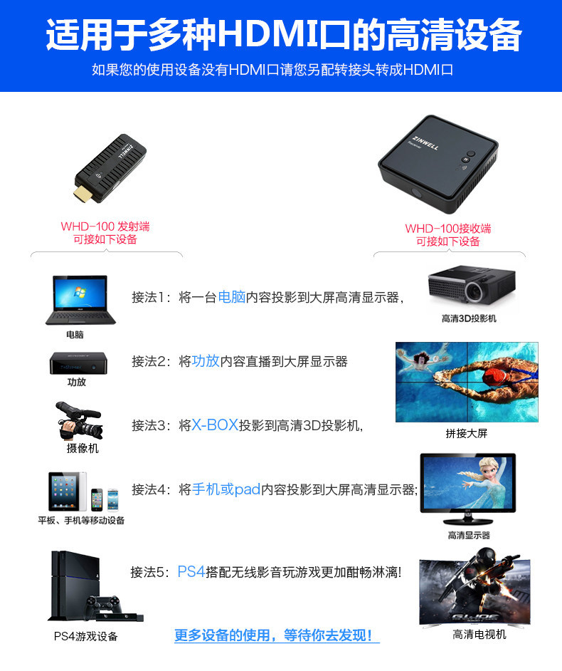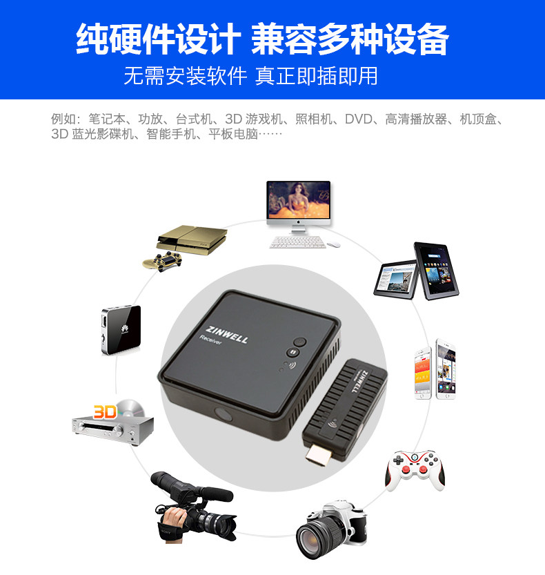 Беспроводной HDMI-передатчик 3D-аудио и видео высокой четкости WHD-100 представляет собой компактный беспроводной HDMI-передатчик 3D-аудио и видео высокой четкости, использующий технологию WDHI израильской компании AMIMON. Он может передавать по беспроводной сети изображения высокой четкости с проигрывателей Blu-ray, проигрывателей высокой четкости и компьютеров на устройства отображения.Когда беспроводной передатчик подключен к компьютеру, он не требует драйверов и имеет очень удобную конструкцию.Zinwell Electronics Co., Ltd. (ZINWELL) — компания с 32-летним опытом исследований и производства микроволновых технологий, ее продукция отличается надежным качеством.В то же время этот набор аудиовизуальных беспроводных передатчиков в основном продается в Европу, США и другие страны и соответствует зарубежным стандартам безопасности и техническим стандартам.Он может удовлетворить различные потребности в беспроводной передаче аудио и видео высокой четкости для домашних развлечений, деловых презентаций, конференц-залов, обучения и т. д. Чтобы избежать помех при беспроводной передаче, WHD-100 использует технологию WHDI, основанную на частотном диапазоне 5 ГГц и уникальной высокопроизводительной технологии динамического скачкообразного изменения частоты DFS. При обнаружении других радиочастотных сигналов беспроводной связи в том же диапазоне частот он автоматически переключается на оптимальный диапазон частот и обладает сильной защитой от помех.