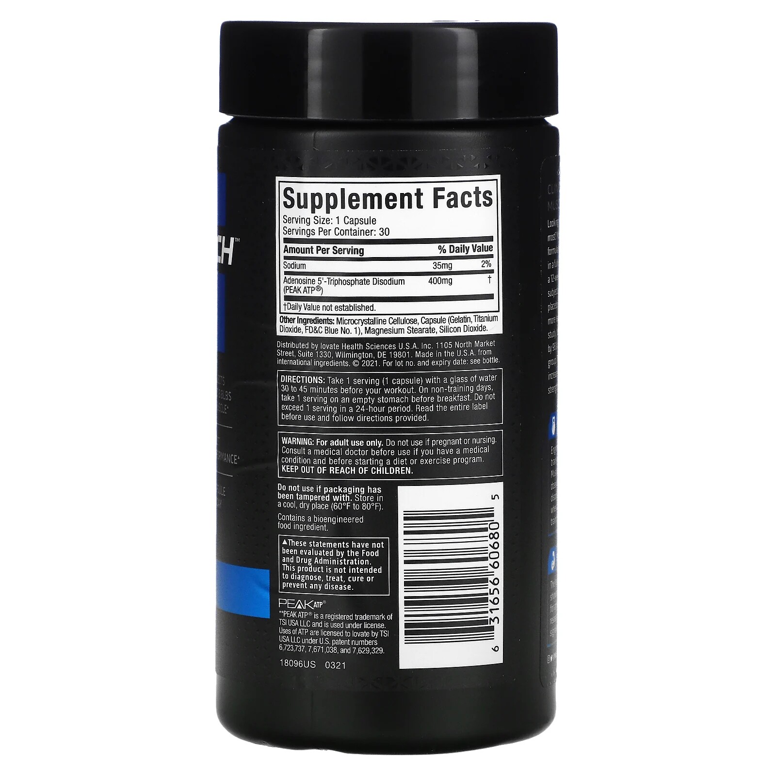 Дополнительные ингредиенты Поличия: 1 дозировка капсулы на бутылку: 30 Содержание на порцию Процент ежедневного впускного аденозина 5'-дизодий трифосфат (пик АТФ) 400 мг Процент ежедневного потребления 入 摄 не был определен.