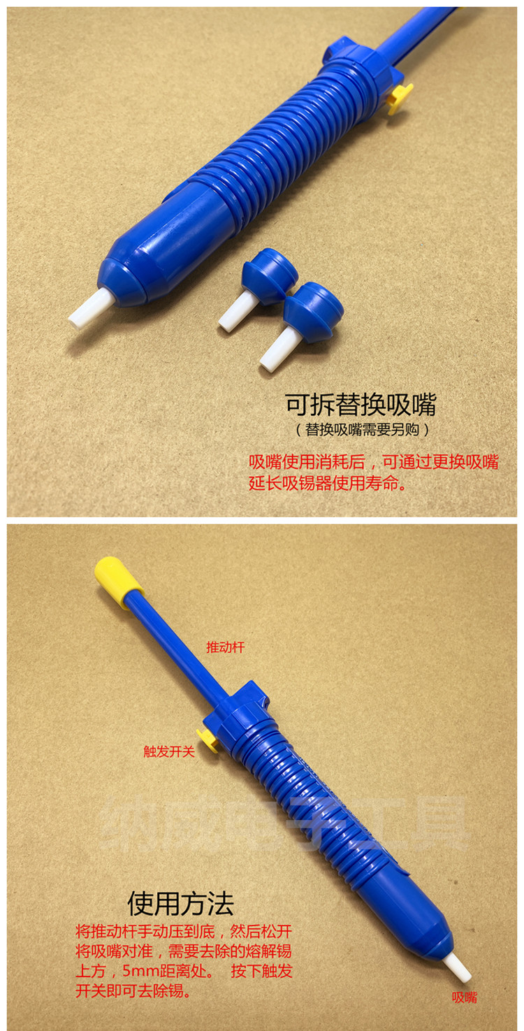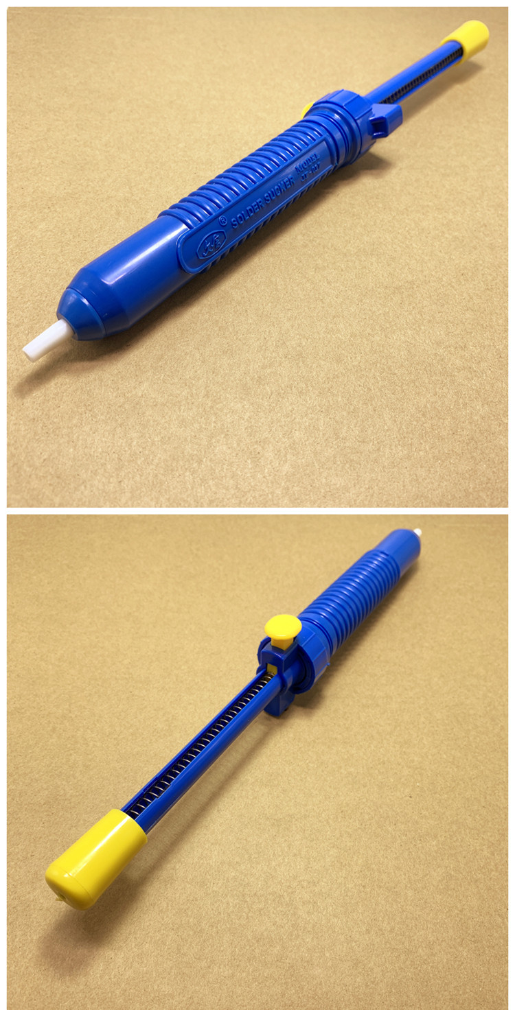Простые изделия из олова всасывания являются ручными, а материал, как правило, представляет собой пластиковый и алюминиевый сплав. Из -за его частого контакта с высокой температурой его голова обычно изготавливается из тепло -резистентного пластика.