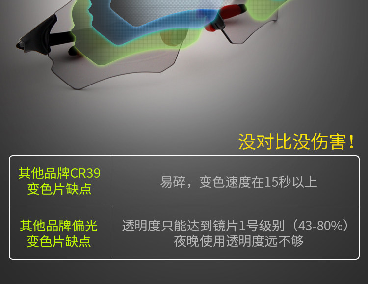 2. Недостатки линз поляризующих изменений цвета: прозрачность может достигать только уровня 1 (43-80%), а прозрачности недостаточно ночью.