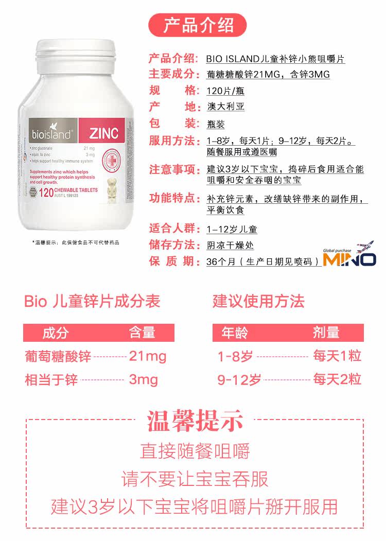 Spot Australian Bio Island цинк таблетка для детей анорексии детей дополнение цинкового медведя жевать цинковые чип 120