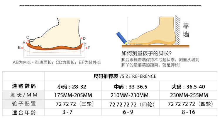 | Размер обуви: | Трехколесный велосипед размера S (28-32/длина фута 17,5-20,5 см)., M-код четыре колеса 33-36,5/длина фута 21-23 см., L Код четыре колеса 36,5-40/длина фута 23-26 см. |