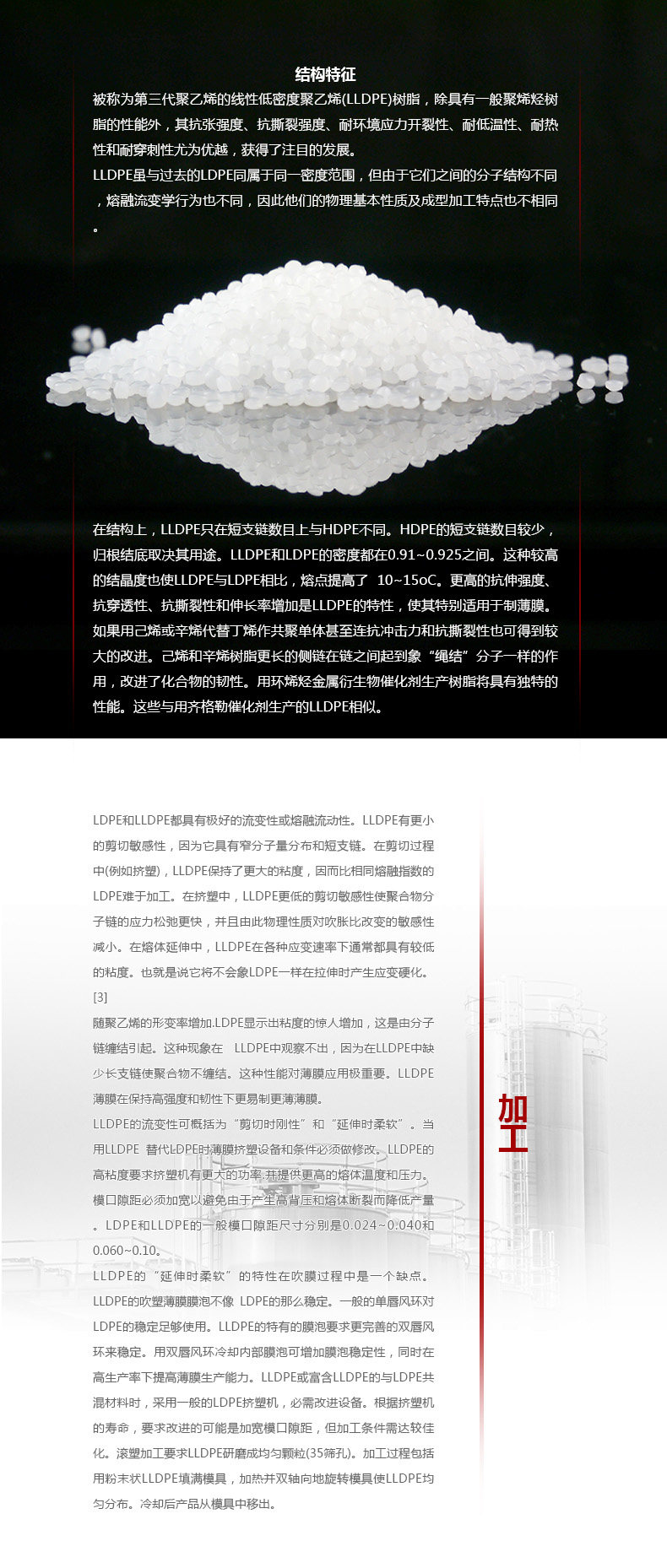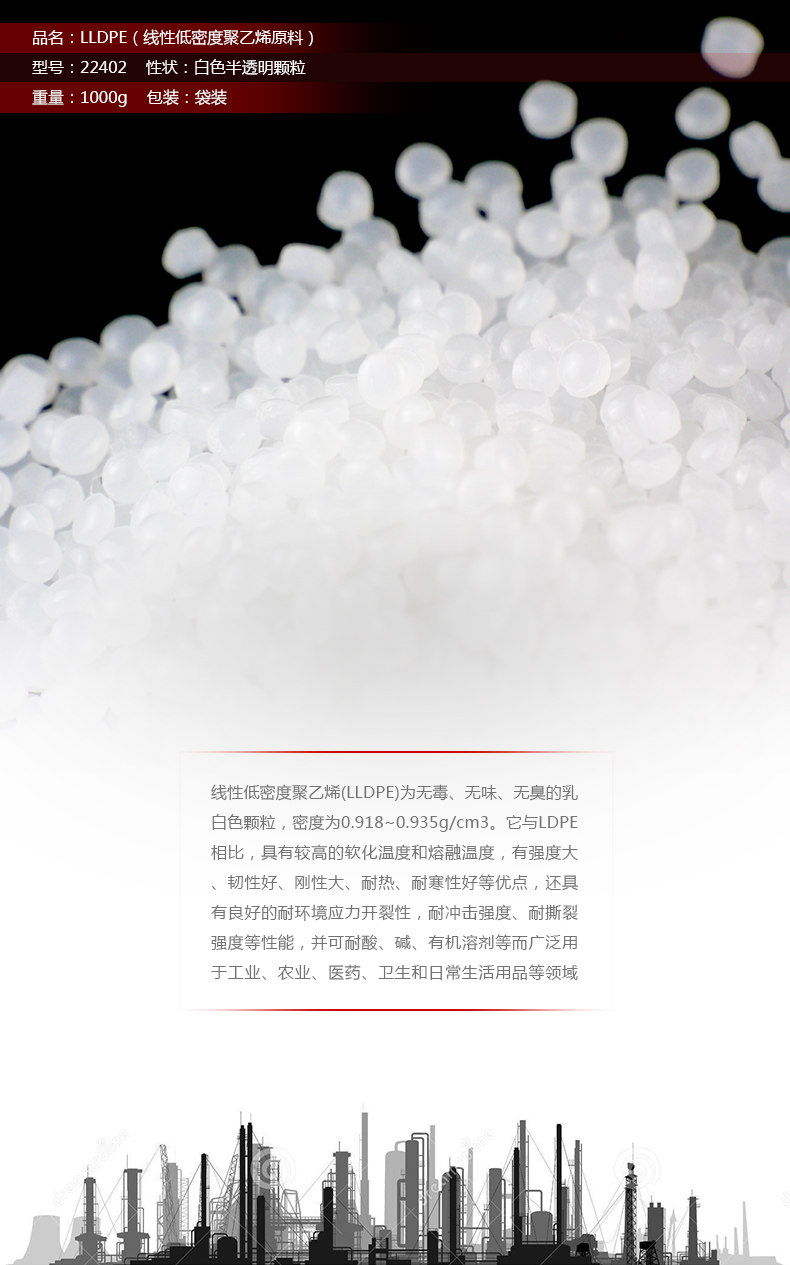 Продукты LLDPE являются неоксичными, без запаха, без запаха и молочных гранул.По сравнению с LDPE, он обладает преимуществами высокой прочности, хорошей вязкости, сильной жесткости, теплостойкостью, холодной стойкости и т. Д., А также имеет хороший стресс в окружающей среде, прочность на разрыв и другие свойства, а также может сопротивляться кислоте, щелочим, органическим растворителям и т. д. (LLDPE). Это этилен и небольшое количество продвинутых&Альфа; 0,915 ~ 0,940 г/кубический сантиметр.Однако, согласно правилам D-1248-84 ASTM, диапазон плотности от 0,926 до 0,940 г/кубический сантиметр представляет собой полиэтилен средней плотности (MDPE).Новое поколение LLDPE расширяет свою плотность до пластикового корпуса (0,890 ~ 0,915 грамм/кубический сантиметр) и упругое тело (<0,890 грамм/кубический сантиметр)