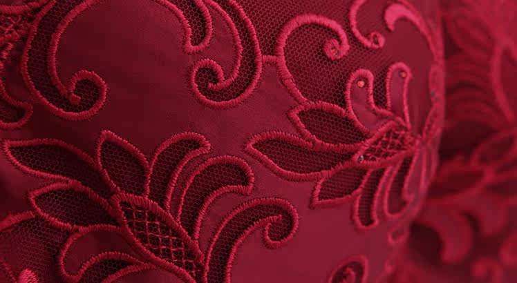 Удобная, мягкая, изысканная и красивая вышитая цветочная сплайсинговая глянцевая ткань, в сочетании с блестящим украшением алмаза, богатыми слоями и ясной текстурой, и уши слегка показывают кожу груди, подчеркивая очаровательное очарование женщин и сексуальные и элегантные.