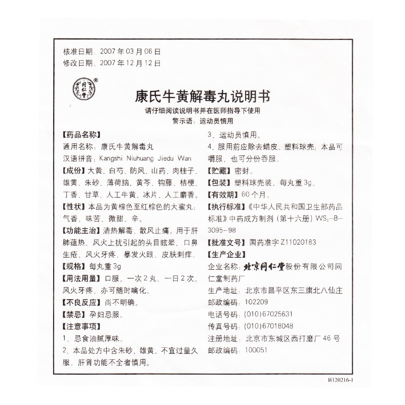同仁堂 Niuhuang Detox Pill 3g*10 Pill/Box Clear Heat, детоксикация и рассеяние ветра, используемые на жаре печени и легких, горячие и пожарные, головокружение вызвано