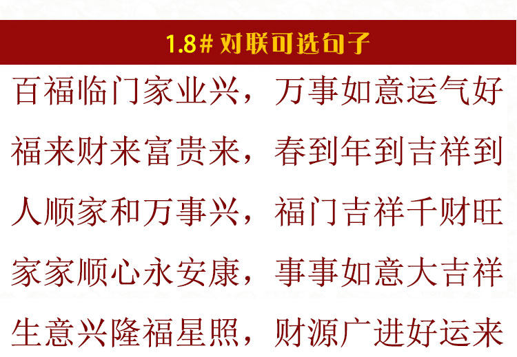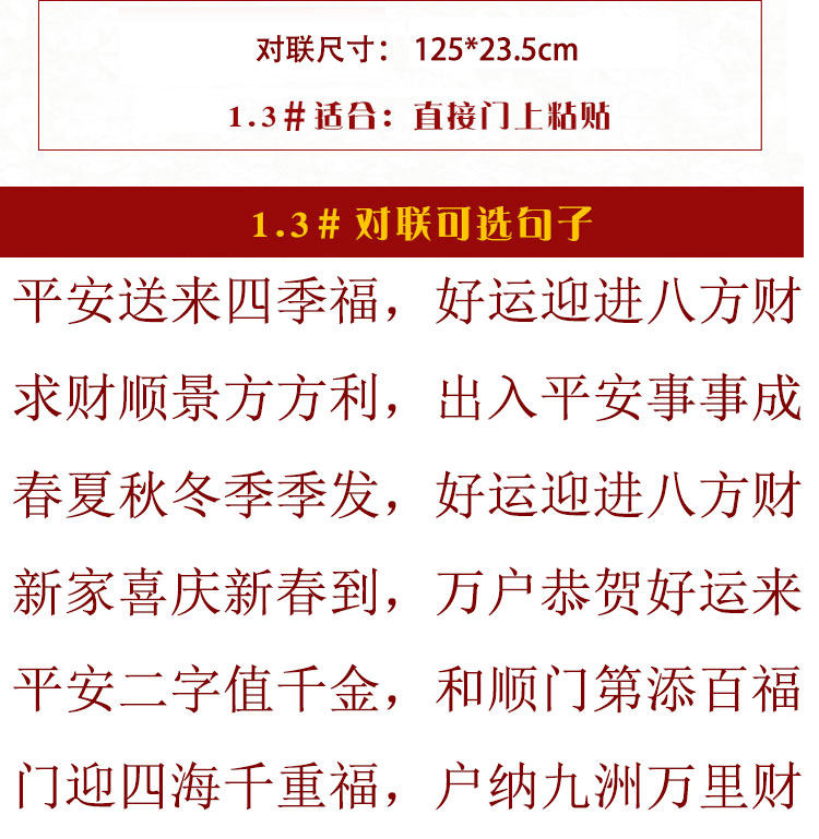 | Длина: | 1.3 Безопасно принесите благословение четырех времен года (высота 125 см), 1.3 Fortune Fangli (высота 125 см), 1.3 Весна, лето, осенний и зимний сезон (высокий 125 см), 1.3 Новый семейный праздничный весенний фестиваль до нового года (высокий 125 см), 1.3 PING Значение двух слов (высота 125 см), 1.3 Дверь приветствует тысячи благословений со всего мира (высота 125 см), 1.6 Встречайте Новый год с благополучием и удачей (рост 145см), 1.6 Хешун Тимберфорд (рост 145см), 1.6 Основатель -основатель (высота 145 см), 1.6 Открытие двери Dajiyu Caiyuan (High 145 см), 1.6 Удачи весной, летом, осенью и зимой (рост 145см), 1.6 Family Happy Welcome Baifu (рост 145см), 1.8 Baifu Linmen Family Real Estate (высота 163 см), 1.8 Фу Лай Кай Лай Фугуи Лай (рост 163см), 1,8 человек Шунцзия и шедевр (высокий 163 см), 1.8 СЕМЬИ Юн'ан Кан (высокий 163 см), 1,8 Старшая фотография (высокая 163 см), 2.2 Семья Синччан Синье (высота 190 см), 22 000 вещей, как удача (высокая высота 190 см), 2.2 Весенняя земля Цветок Цветок (высота 190 см), 2.2 Человечество и пожелания (высокий 190 см), 2.2 Men Ling Avenue Caiyuan Vision (высокий 190 см), 2.2 Fortune Lush для Санцзяна (высокий 190 см) |