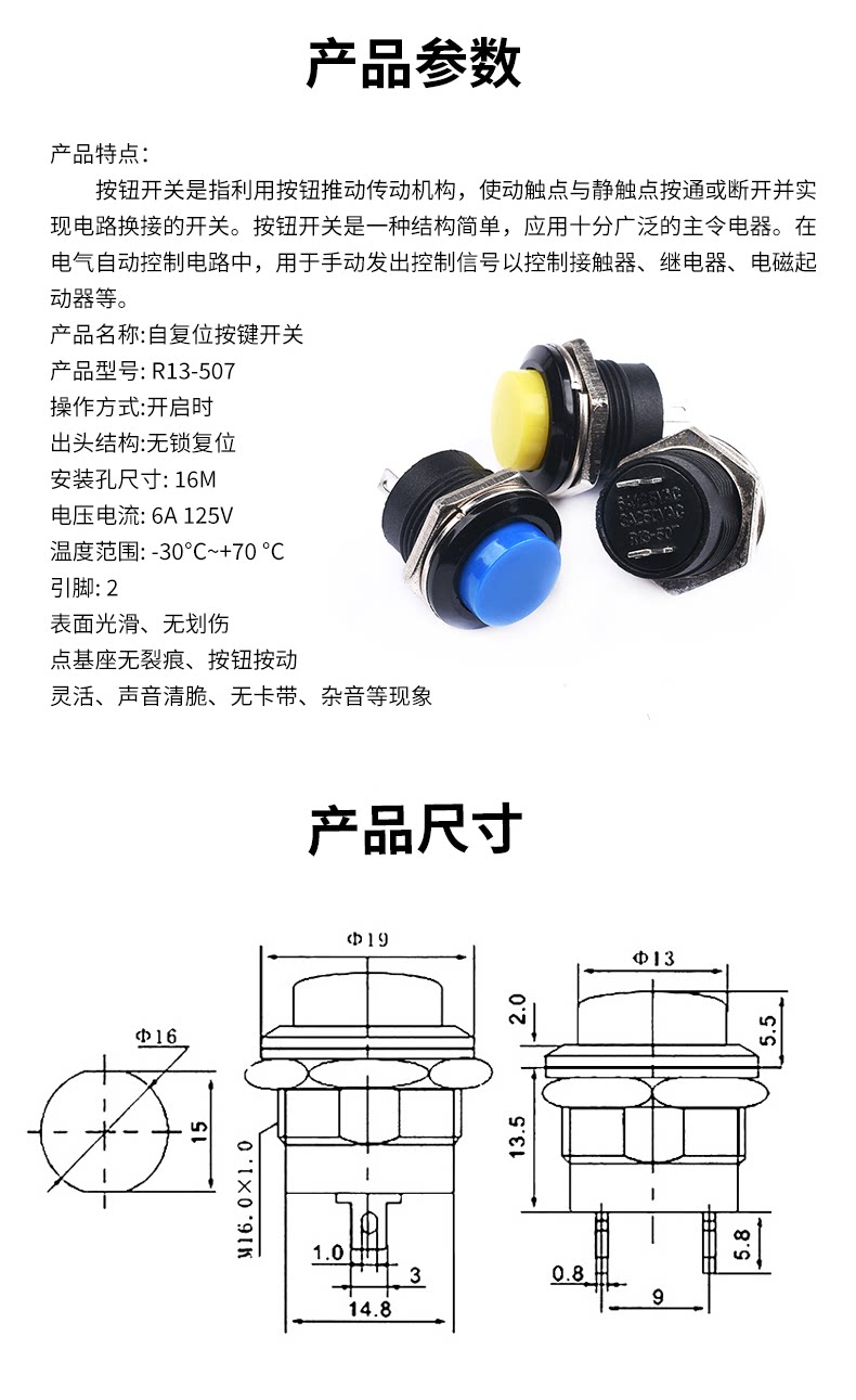 Кнопка, круглый желтый переключатель, 16mm