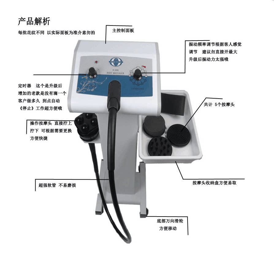 Аксессуары: пять различных функциональных массажных головок (колонка -Массажная головка, массажная головка типа душевого типа, круглая губка массажная головка, полусферическая массажная головка, U -образная массажная головка), с переменным преобразованием угла, подходящая для китайских человеческих характеристик три три умных работа Программа (переключение источника питания, бесщеточный двигатель, антиэлектромагнитные помехи), оборудованная белой поддоном, рама лотка!