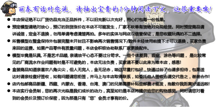 | ОЧЕНЬ КРУТО Вэй, крутая модельная игра: 1/6, третья часть серии «Cross Fire»—“Защитник Spirit Fox” Лиса Их ясные глаза, аккуратные короткие волосы, изящные талии, сексуальные фигуры, гибкое мышление и ловкие навыки - их внешность снова заставляла людей сиять. Они практически не участвовали в каких-либо учениях, но смогли безупречно выполнить каждую задачу.Это духи-лисы, исчезнувшие на долгое время. Красавицы в этой организации хорошо владеют различным оружием и хорошо сотрудничают друг с другом.Однако, чтобы избежать прямых конфликтов со своими могущественными врагами, Охотниками на лис, они часто путешествуют по отдельности и появляются вместе только в определенное время каждые несколько лет. Охотникам на лис и другим внешним группам следует опасаться их, поскольку легенда гласит, что они массово появятся снова в 2010 году нашей эры.…… Это особая группа, которая может объединиться, чтобы победить любую неудержимую силу. Они могут противостоять давлению любой организации и двигаться вперед. Их появление повлекло за собой приход новой моды. “Дух Лиса, действие начинается!” Название продукта: 1/6 Crossfire-Lingfox Guardian Номер продукта: VC-CF-03 Список продуктов: - Имитация скульптуры головы после трансплантации волос - Бесшовный женский корпус из стали PH - Темно-синее боевое платье. - Кружевные подвязки - красное нижнее белье - красный бюстгальтер - шпильки - Кожаные сапоги на высоком каблуке. - Значок духовного лиса*1 - Белая сумка для разных вещей*1 - Рука в перчатках естественной формы руки*2 - Рука в перчатках*2 - Рука в форме кулака*2 - Перчатка с крючком для правой руки. - снайперский пистолет AWM - Ложа снайперской винтовки AWM - Магазин для снайперской винтовки AWM. - снайперский прицел AWM - Пистолет П226 - Пистолетный магазин П226*1 - Собранный деревянный ящик*1 - Чехол для коробки из военной ткани * 1 Ожидаемый срок поставки: третий квартал 2017 г. Заявление об авторских правах «CrossFire»: Прототип этого продукта (т.е. «CrossFire»,“Диаграмма перекрестного огня”и другие материалы, связанные с игрой), права интеллектуальной собственности принадлежат компании Smilegate. Tencent получила разрешение компании и лицензию Hong Kong Weiku Model Toy Co., Ltd.на производство и продажу подвижных фигурок из игры «Cross Fire». Представленные на рынке фигурки солдат, которые не производятся Weiku Mowan и не имеют знака защиты от подделок Tencent, являются пиратской продукцией.Пожалуйста, поддержите официальную версию! COPYRIGHT©1998-2016 TENCENT.ALL RIGHTS RESERVED. COPYRIGHT©SmileGate Entertainment. |