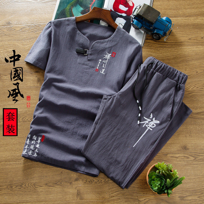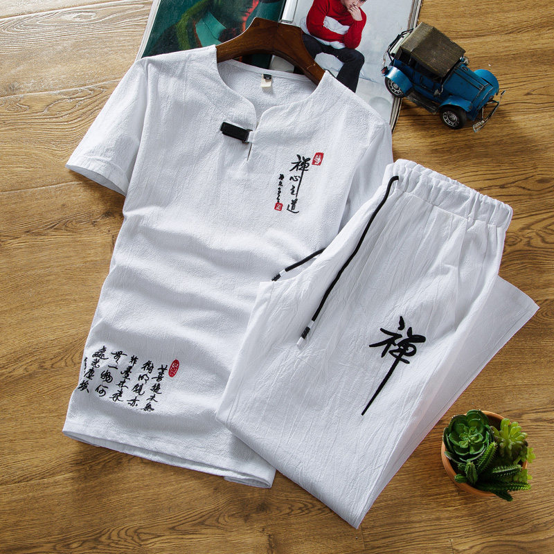 Летний комплект, мужская футболка, короткий рукав, китайский стиль, большой размер, из хлопка и льна