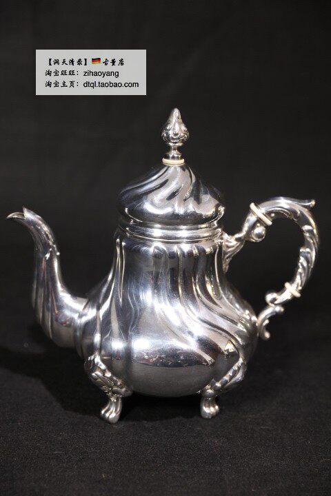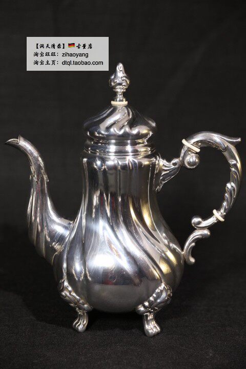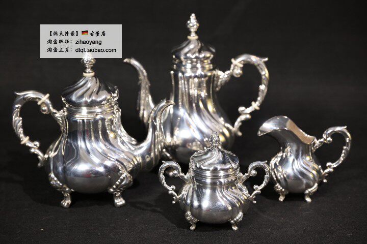 Набор кофейной посуды в стиле барокко, включающий кофейник, чайник, сахарницу и молочник. Нижняя часть столового серебра украшена гравировкой."925 Sterling"и серебряная этикетка со звездой и лунной короной.