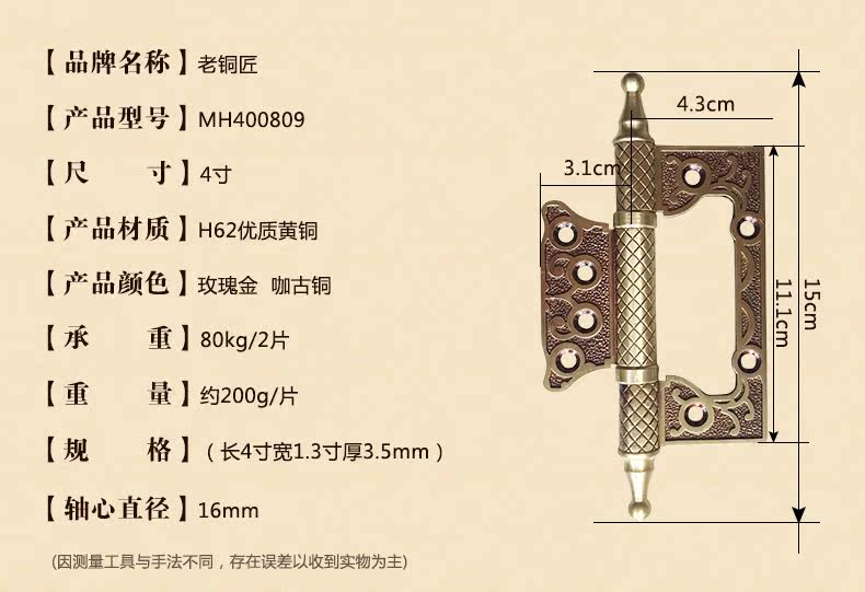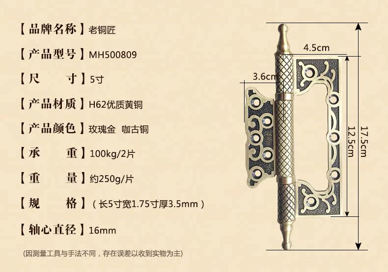 Медный антикварный шарнир, 4 дюймов, увеличенная толщина, 5 дюймов