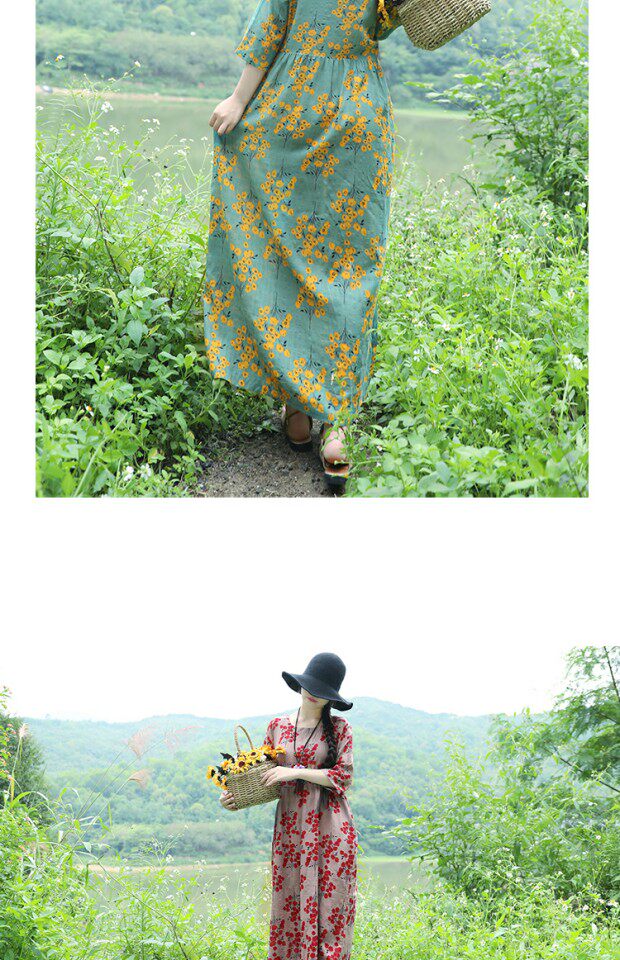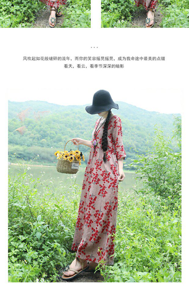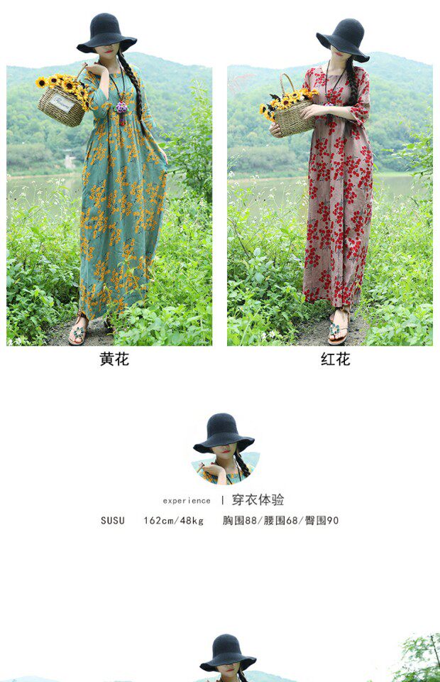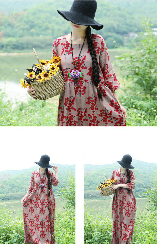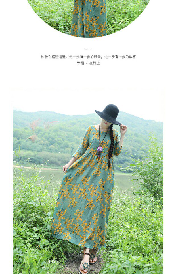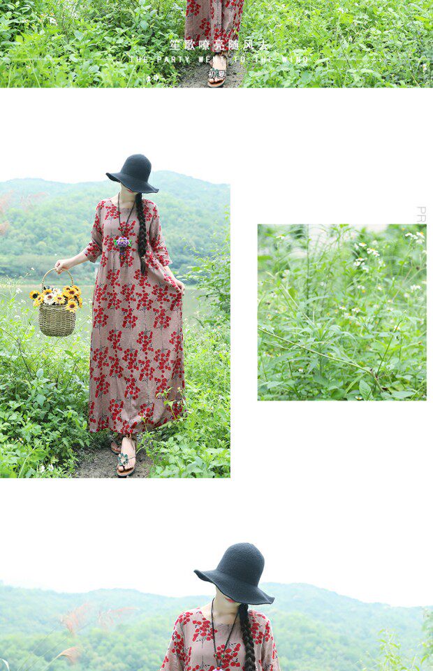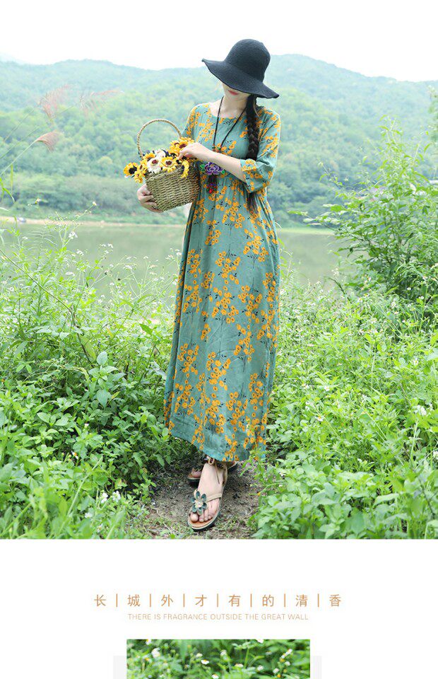 Этническая летняя одежда, платье, длинная юбка, этнический стиль, высокая талия, с рукавом, цветочный принт