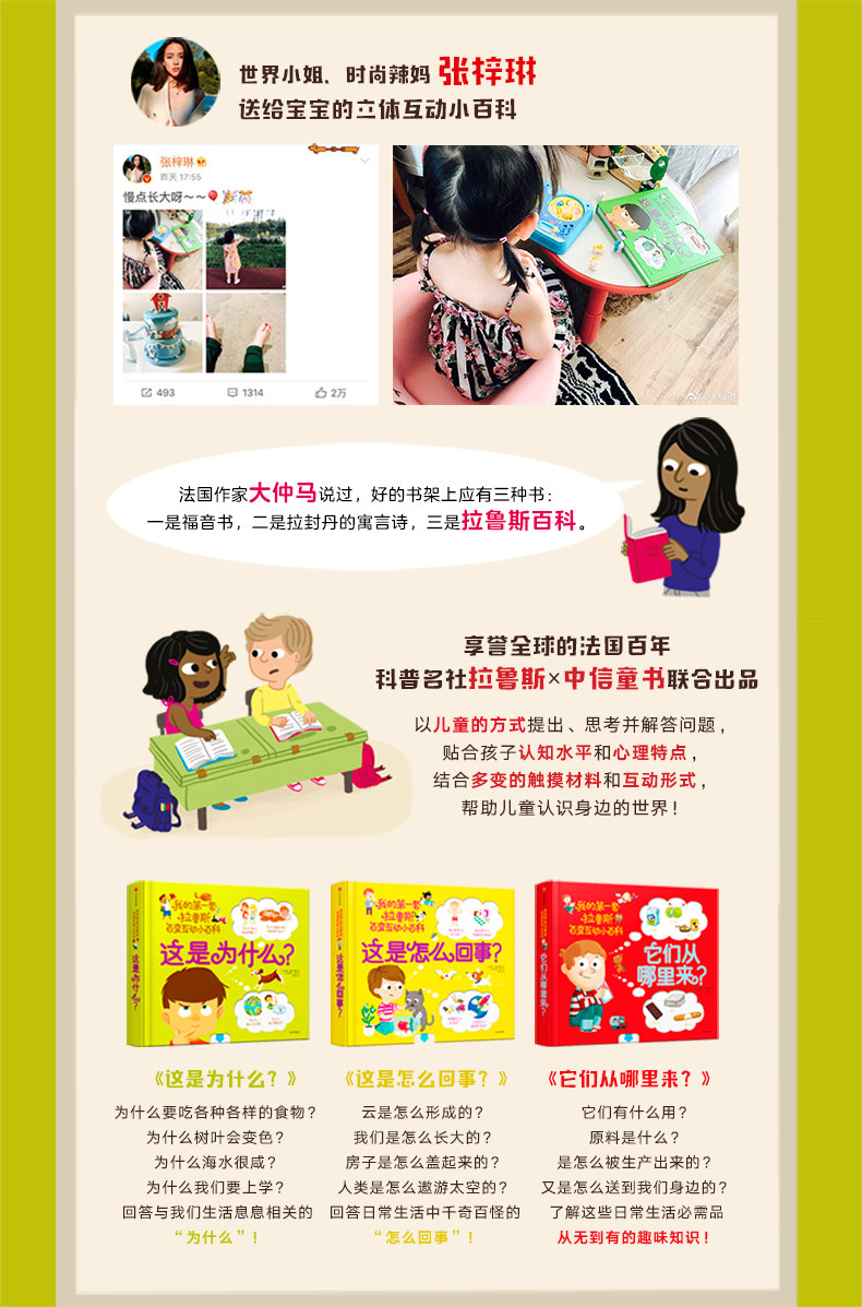 «Мой набор Ларуса Сто и изменение интерактивной энциклопедии» -это набор когнитивной энциклопедии с низким уровнем числа, которая подходит для 2—6 -year -sold дети читают и используют.В сериале есть известный кооператив на популярном и науке, в том числе известный кооператив, в том числе «Почему это?"Как дела?"Откуда они?》 3 тома.Знание в рамке энциклопедии и трехмерное интуитивное взаимодействие может сделать небольших читателей открытыми.Помещать, мышление и ответы на вопросы детей, в соответствии с уровнем познания этого возраста, ребенок начал понимать мир вокруг“Низкая молодая версия 100 000 почему”Сущность