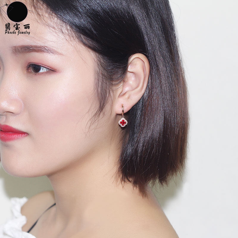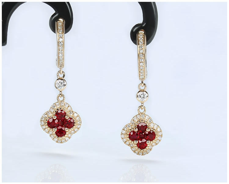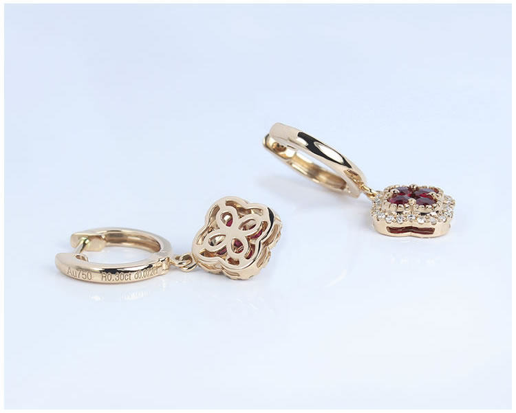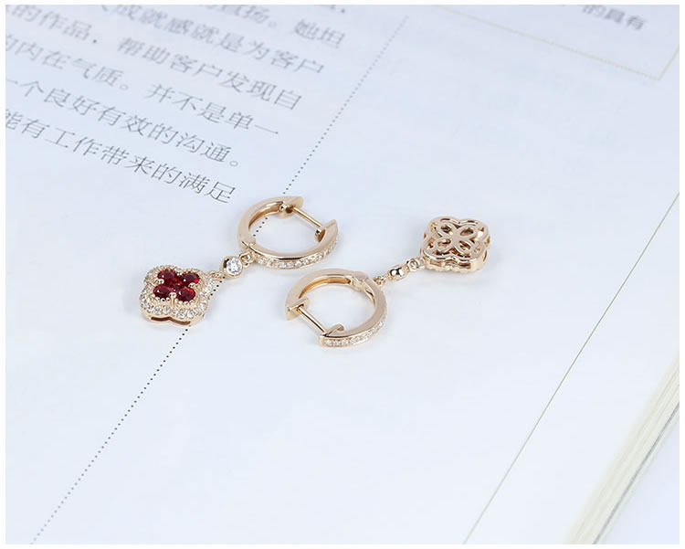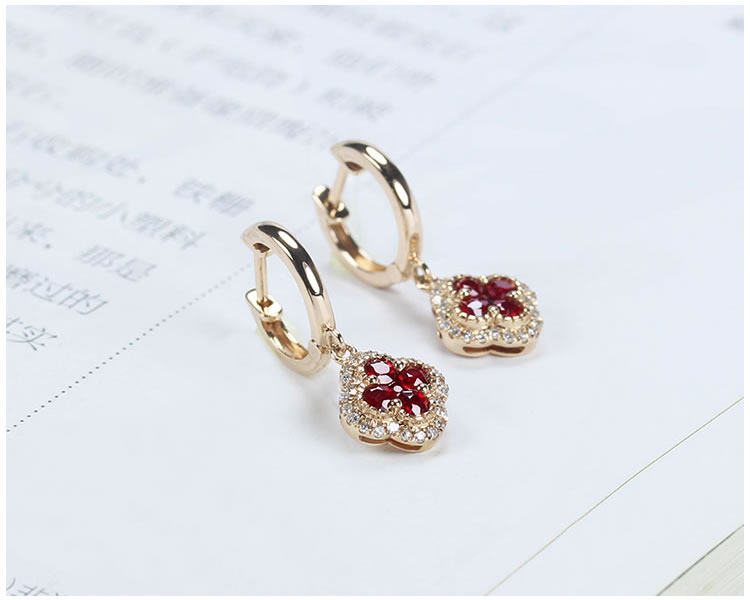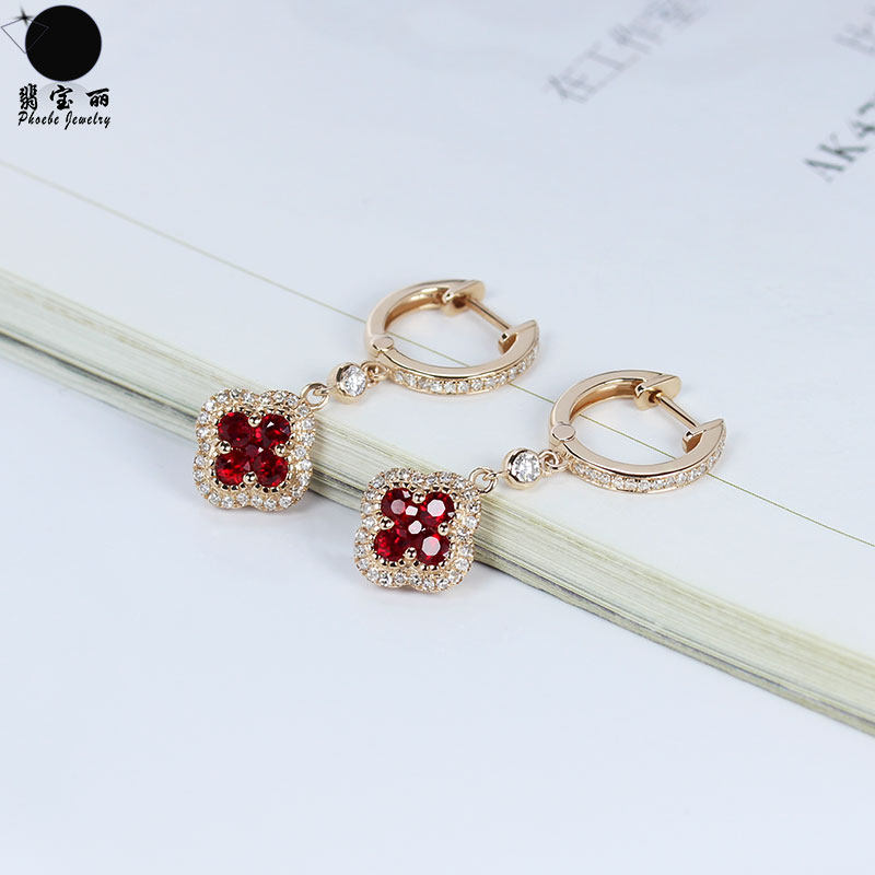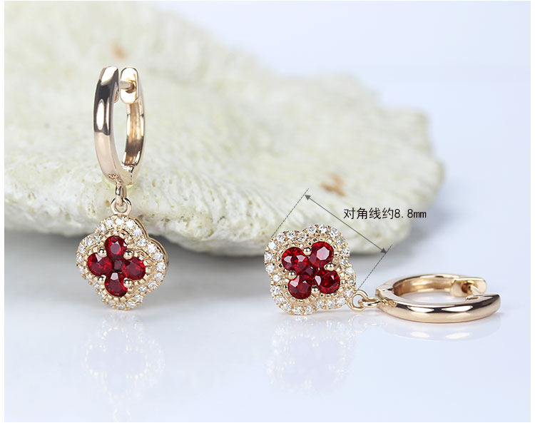 Золотой натуральный рубиновый счастливый клевер, золотые серьги, клипсы, 18 карат, розовое золото