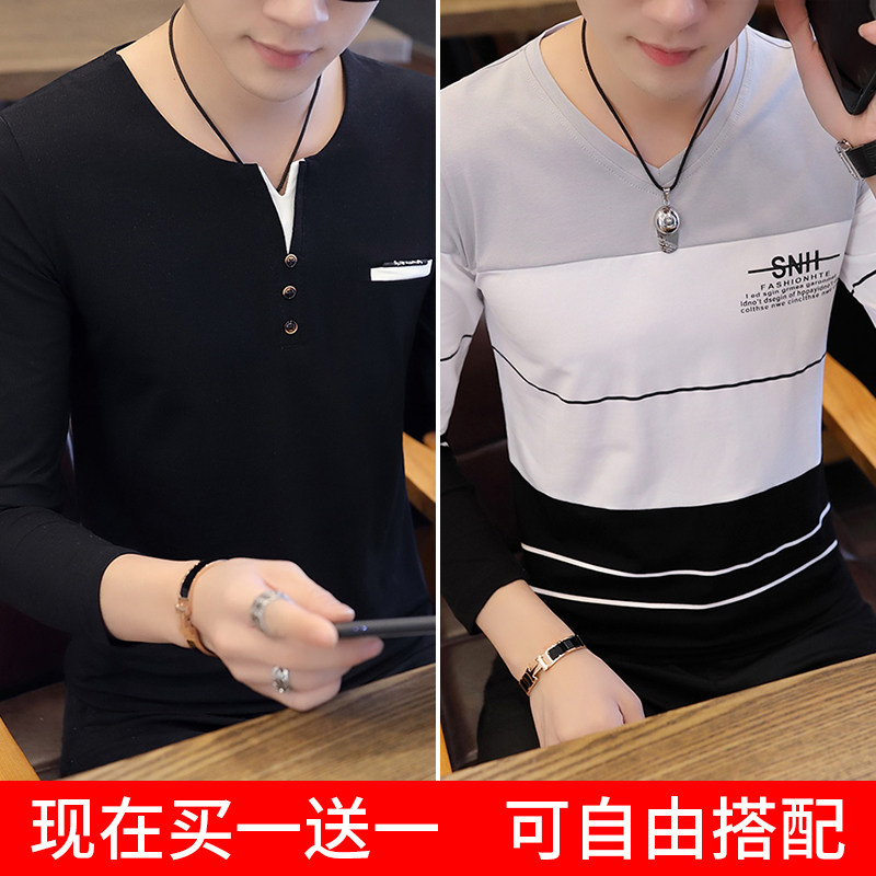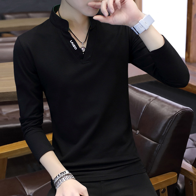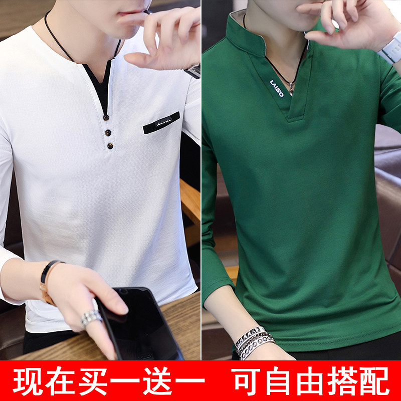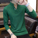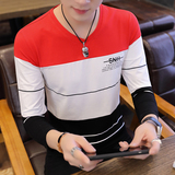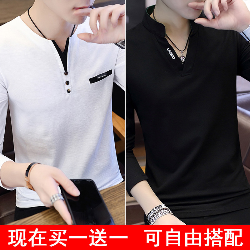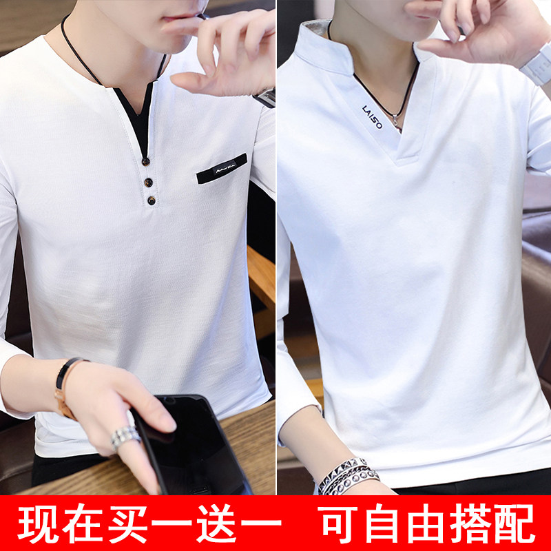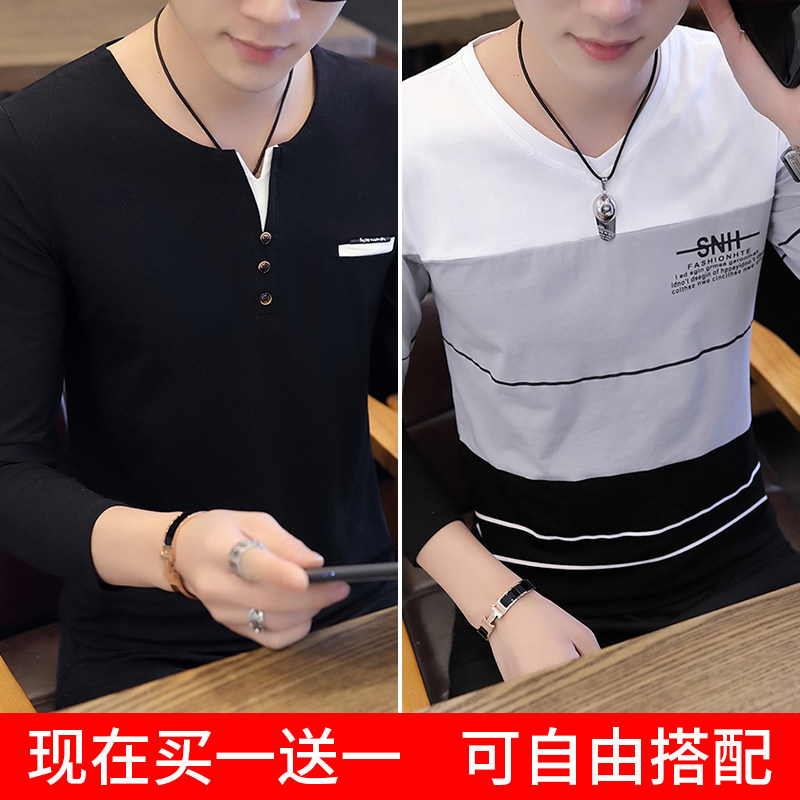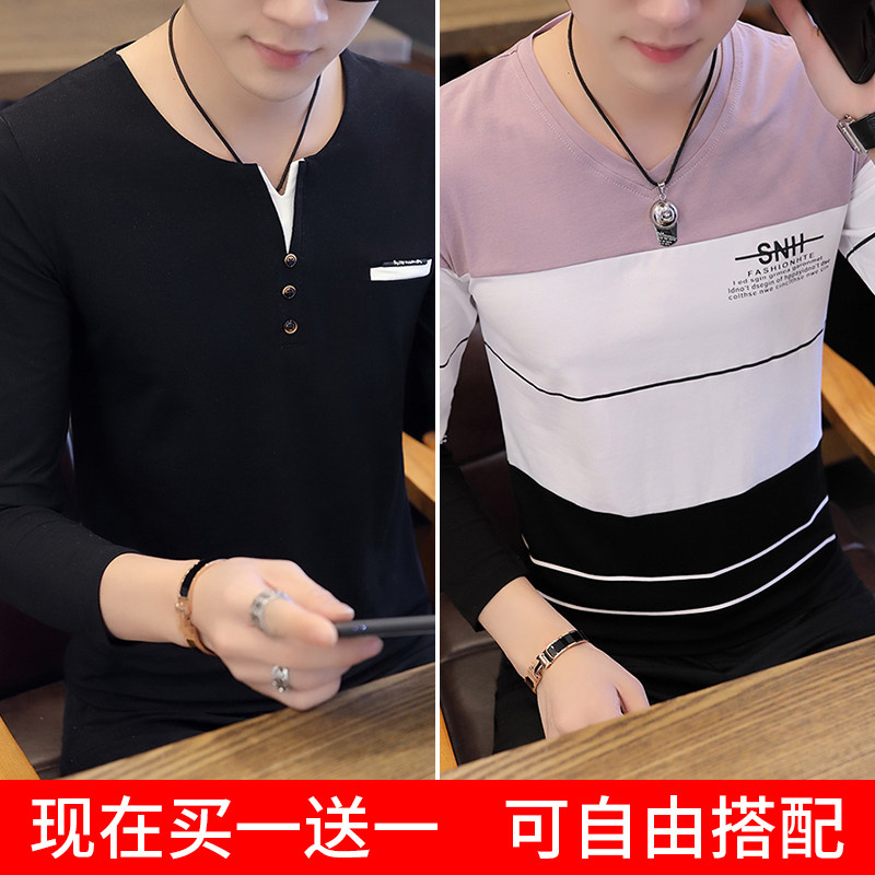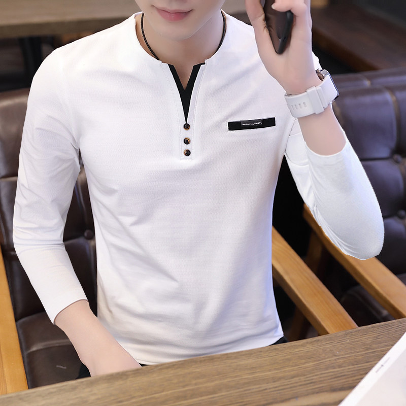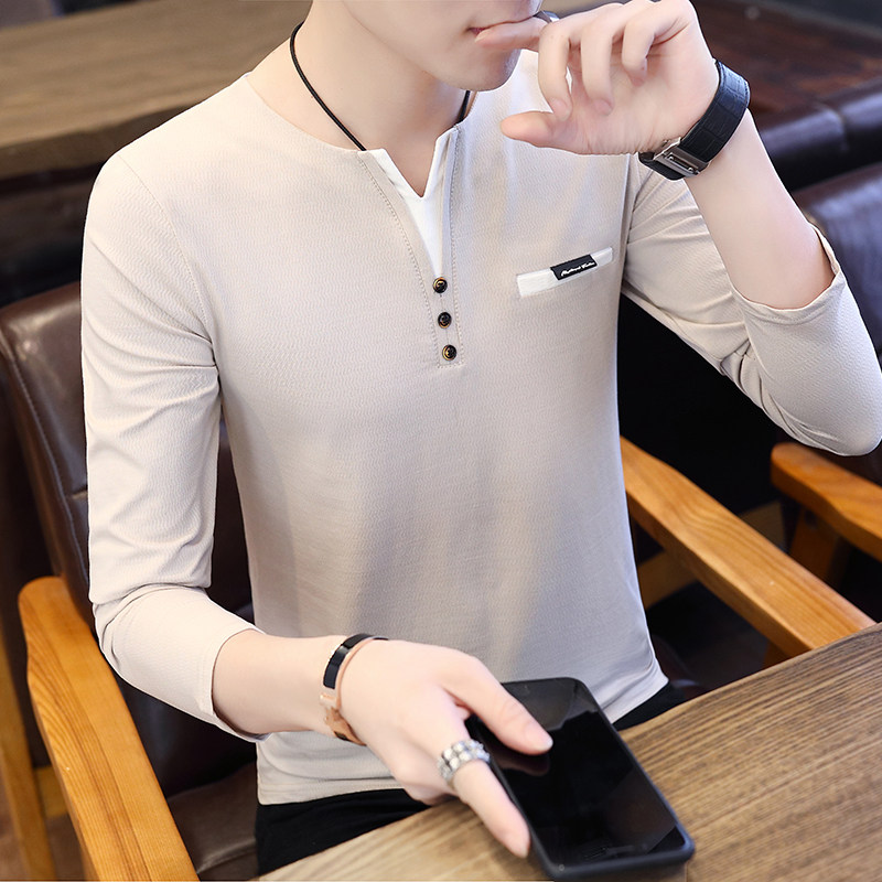 Футболка, мужской трендовый весенний лонгслив, осенняя, в корейском стиле, облегающий крой, V-образный вырез