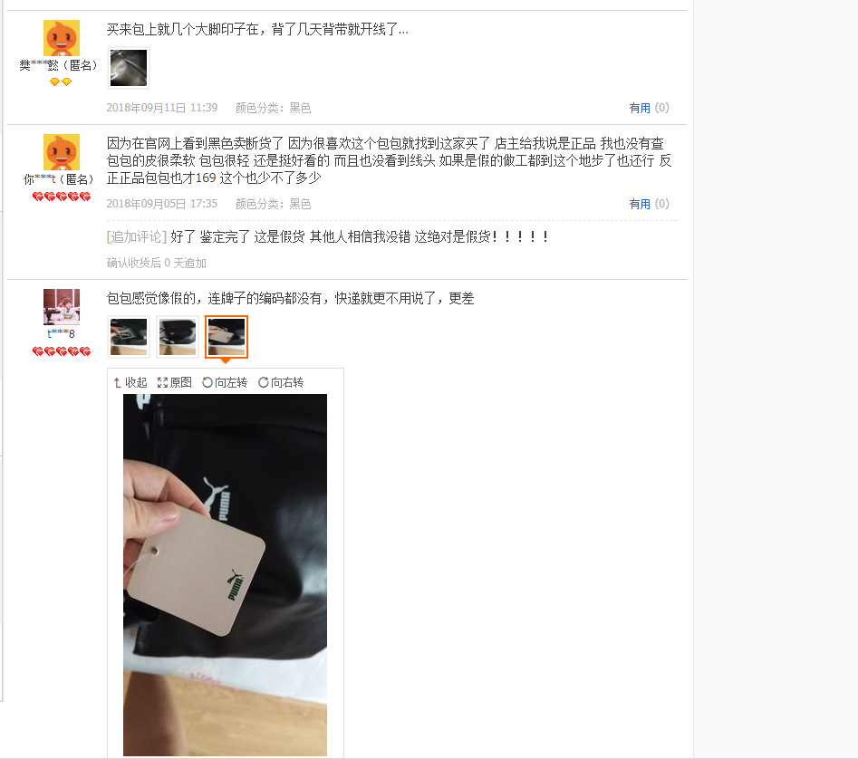 В последнее время появились отдельные отзывы клиентов.Некоторые друзья вокруг меня купили ту же модель в Интернете более чем за 100-200 юаней. После получения результатов изделия качество изготовления самой сумки плохое, материал и ткань крайне плохие, а лямки очень плохие.“Шрифт PUMA”Он напечатан, односторонний, и шрифты легко отваливаются.Внутри сумки нет этикетки, защищающей от подделок.Сущность
