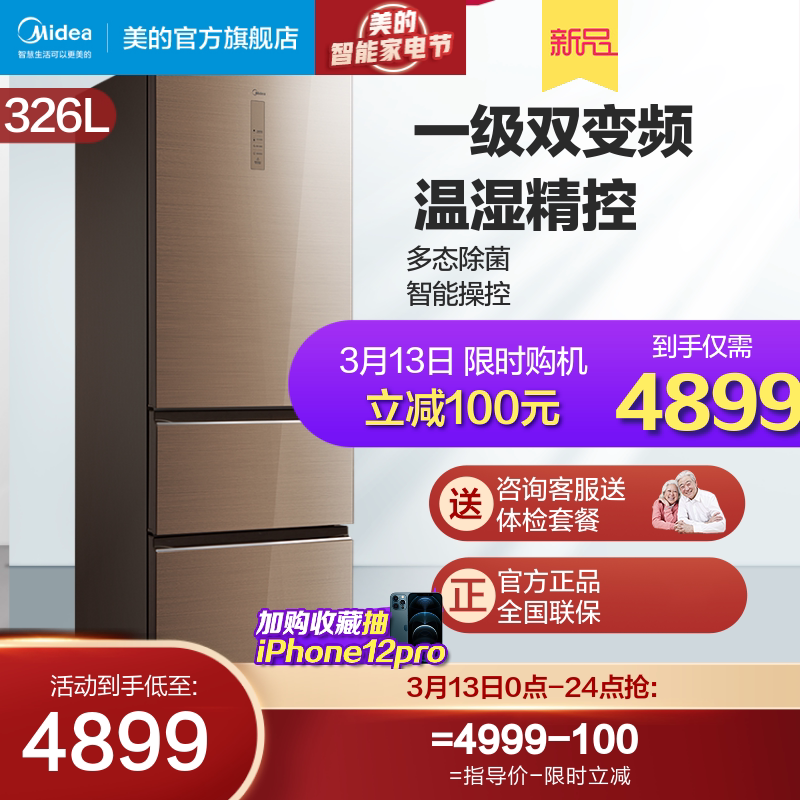 Midea/美的 BCD-326WGPZM Энергосберегающий домашний холодильник Три открытых дверных холодильников без кремовых холодильников