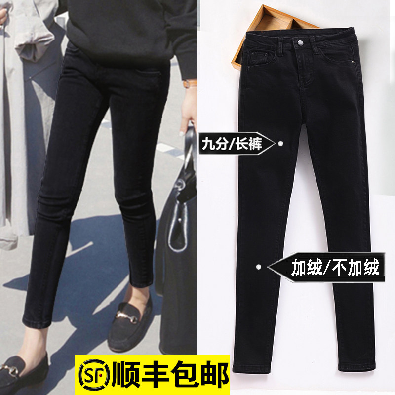 Черные джинсы, флисовые осенние штаны, популярно в интернете, в обтяжку, по фигуре, высокая талия