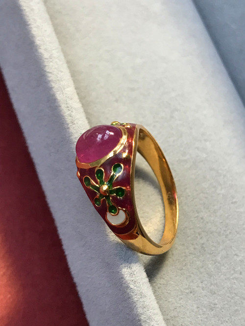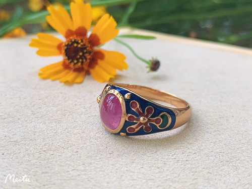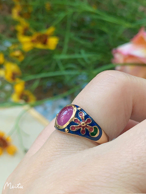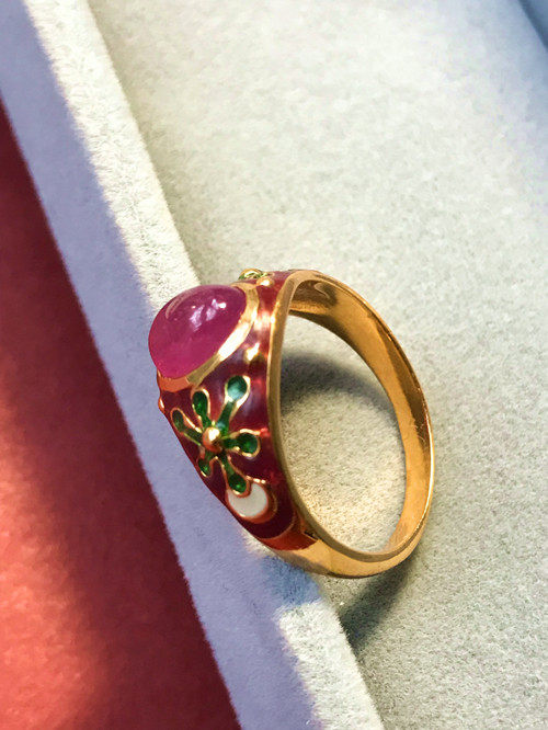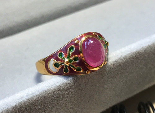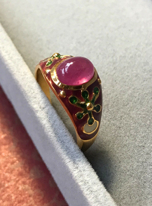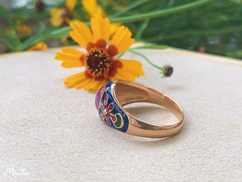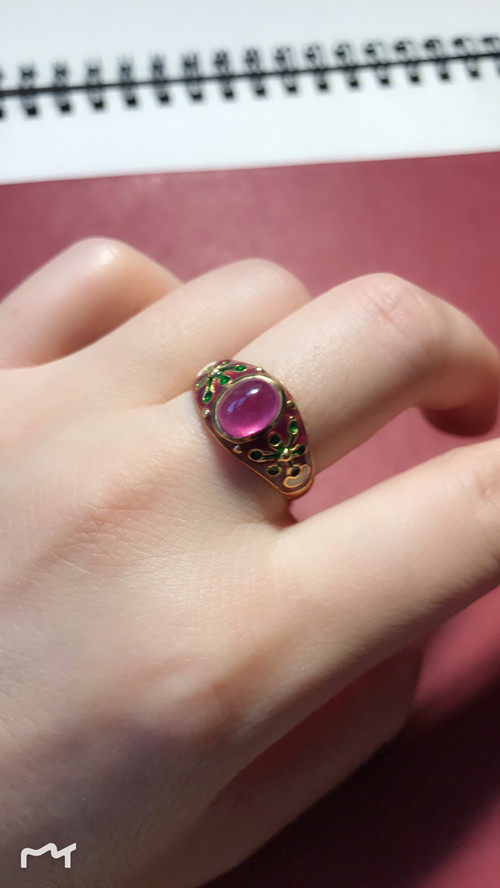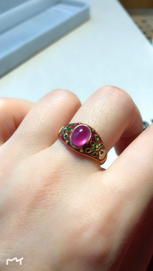 Это очень удобно носить. Эмаль имеет большую площадь и не выцветает. Зеленая/белая/синяя эмаль оттеняет красные и розовые драгоценные камни. В целом кольцо элегантное и элегантное.