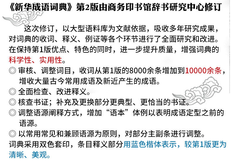 Выпуск D2 «Синьхуа -идиомовый словарь» был пересмотрен исследовательским центром коммерческого словаря.В этом пересмотре используется большой корпус в качестве литературной основы, поглощает годы результатов исследований, а также всесторонне исследования и улучшает различные ссылки словаря, такие как сбор слов, интерпретация и иллюстрация.Поддерживая преимущества и характеристики версии D1, еще больше улучшают качество и повышают научную и практичность словаря.◎ Обзор и скорректирует слова, и количество собранных слов увеличилось с более чем 8000 в версии D1 до более чем 10 000, что увеличило доход большого количества часто используемых идиомов в древние и современные времена и вновь сгенерированные идиомы.◎ Комплексная проверка и улучшение интерпретации.◎ Проверьте документальный сертификат;◎ Отрегулировать метод интерпретации этимологии и увеличить“ язык” тип, чтобы указать этимологию перед стереотипом идиомы.◎ Основываясь на принципе общего использования и принимая во внимание этимологию в качестве принципа, некоторые основные и вторичные линии должны быть скорректированы.Словарь использует двухцветный перепечаток, а значение входа представлено в синем обычном сценарии, который более четкий и красивее, чем версия D1.