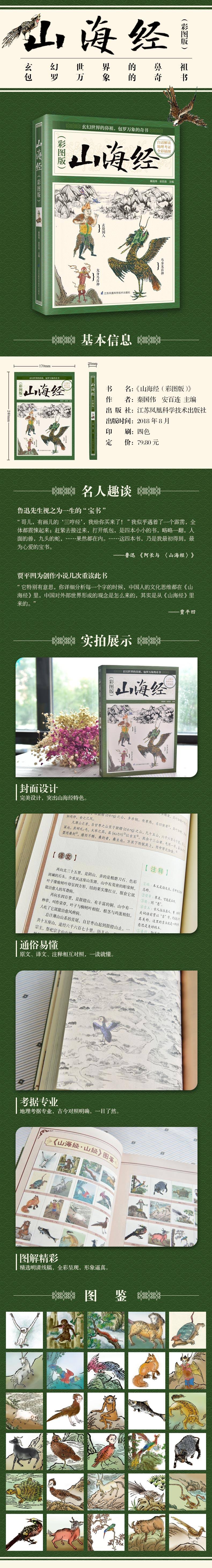 «Шан Хай Цзин» - это древняя книга, которая объединяет географию, Fangwu и народные обычаи.Книга содержит в общей сложности 31 000 слов, в которых записывается около сорока штатов, 550 гор, 300 водных путей и более 100 исторических цифр.Содержание «Шан Хай Цзин» включает в себя мифы, религию, историю, нацию, астрономию, географию, животные, растения, медицина и другие дисциплины.«Шан Хай Цзин (версия цветной карты» выступает против оригинального текста, перевода и примечаний, так что читатели могут понять его без усилий. Во -вторых, «Шан Хай Цзин» проверяется из нынешнего географического положения гор, рек и стран. С более чем 400 животными и персонажами, окрашиваемыми в руку, и окрашивались, приводя читателей в магию SJ "Shan Hai Jing".