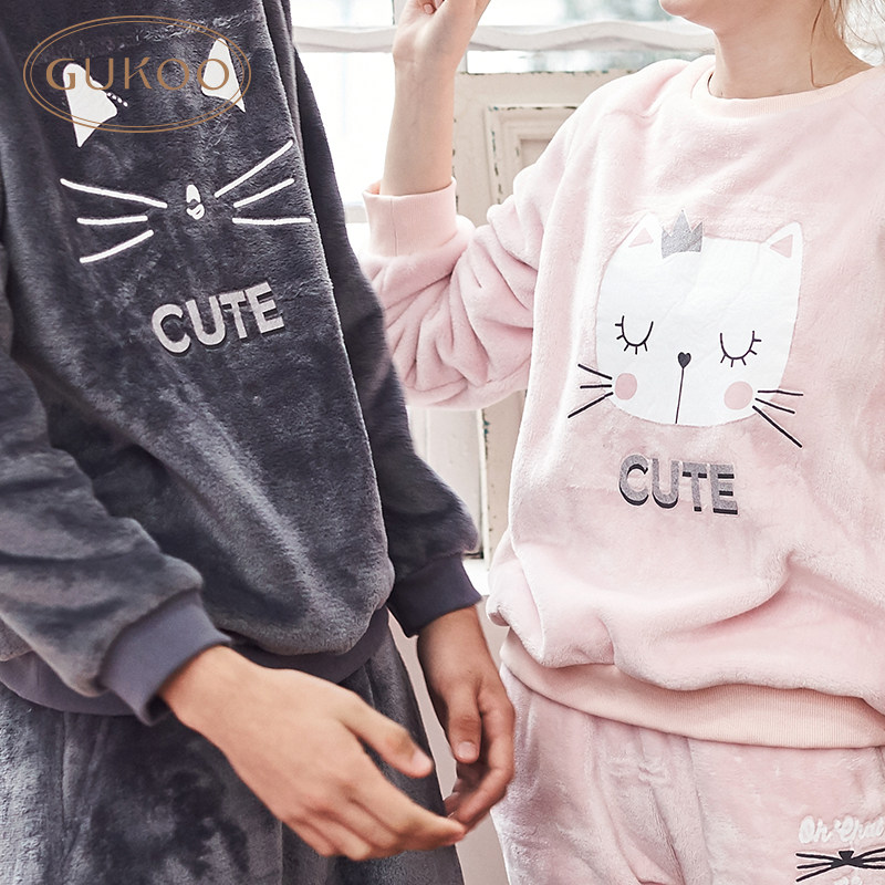 Gukoo/果壳 Пижама для влюбленных, лонгслив, милый зимний коралловый бархатный комплект, простой и элегантный дизайн