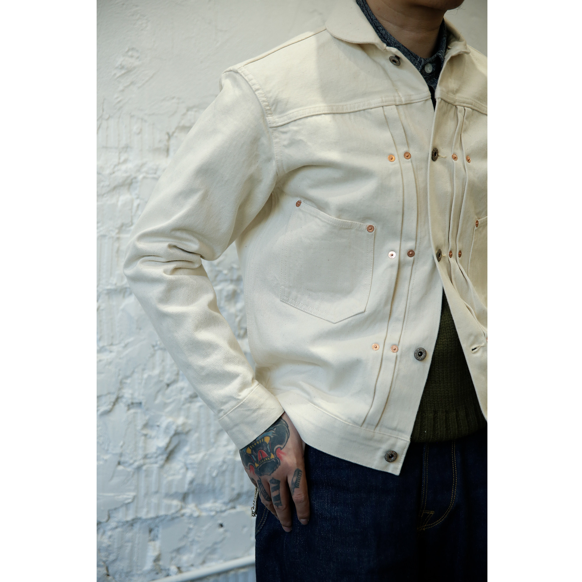 Основываясь на классических джинсовых куртках с 1930 -х годов по 1940 -е годы, как чертех в качестве деталей, детали улучшаются.