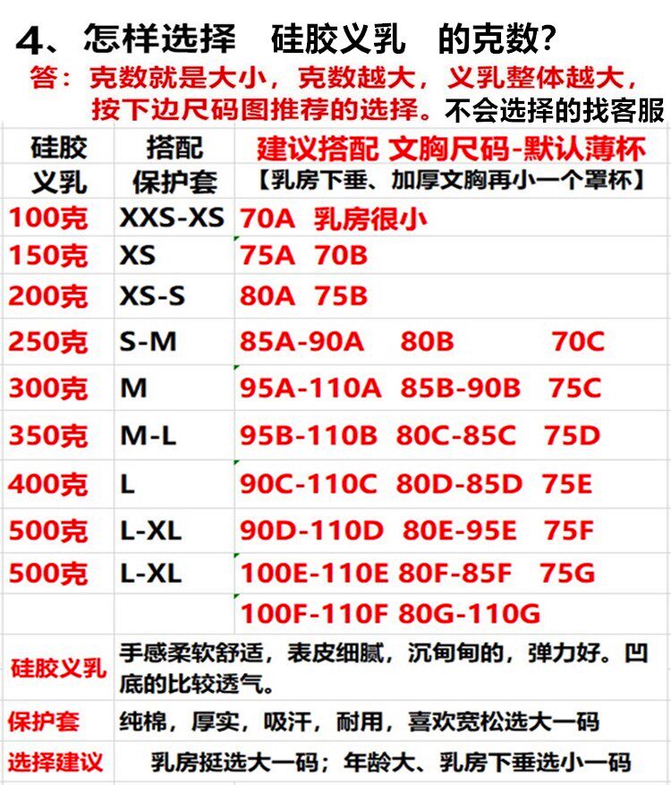 | Размер: | 100 граммов груди с маленькой грудью, 150 граммов с 70-75а 70B, 200 граммов с 80а 75B, 250 граммов с 85-90A 80B 70C, 300 граммов с 95-110A 85-90B 75C, 350 граммов с 95-110B 80-85C 75D, 400 граммов с 90-110C 80-85D 75E, 450 г с большой чашкой C, 500 граммов с 90-110D 80-95E 75F |